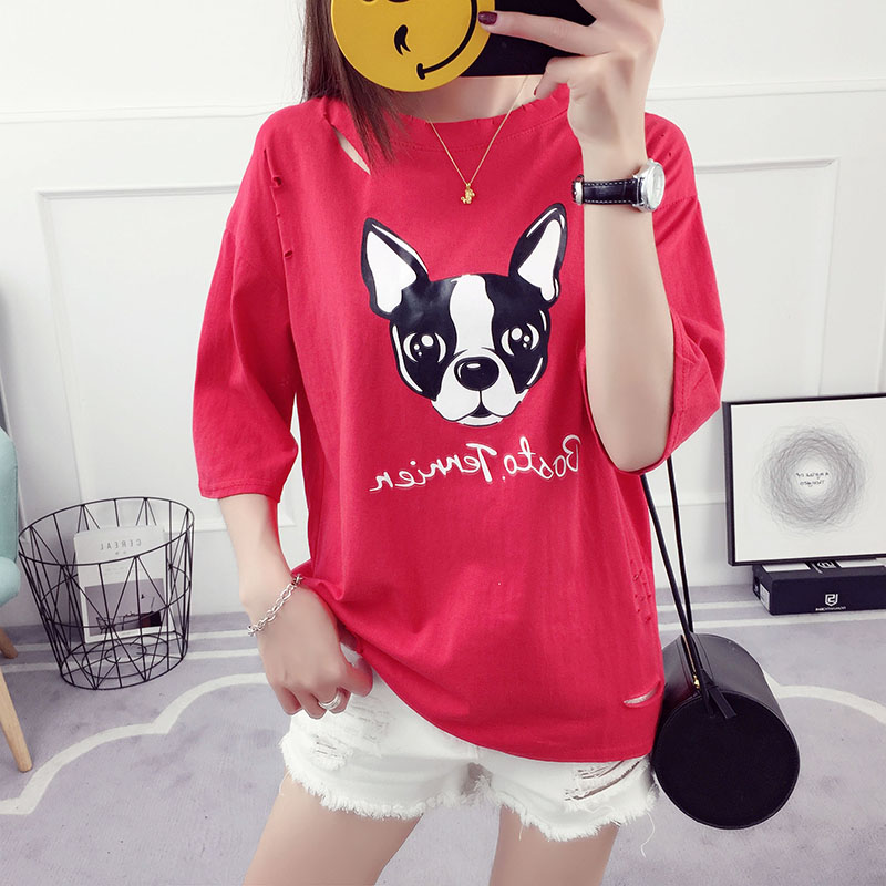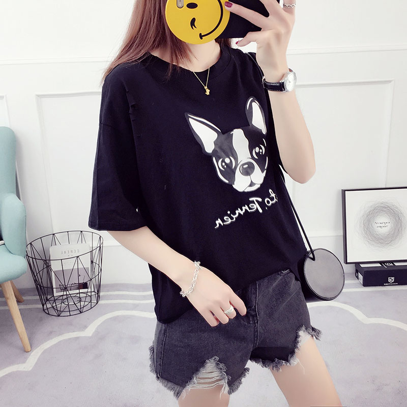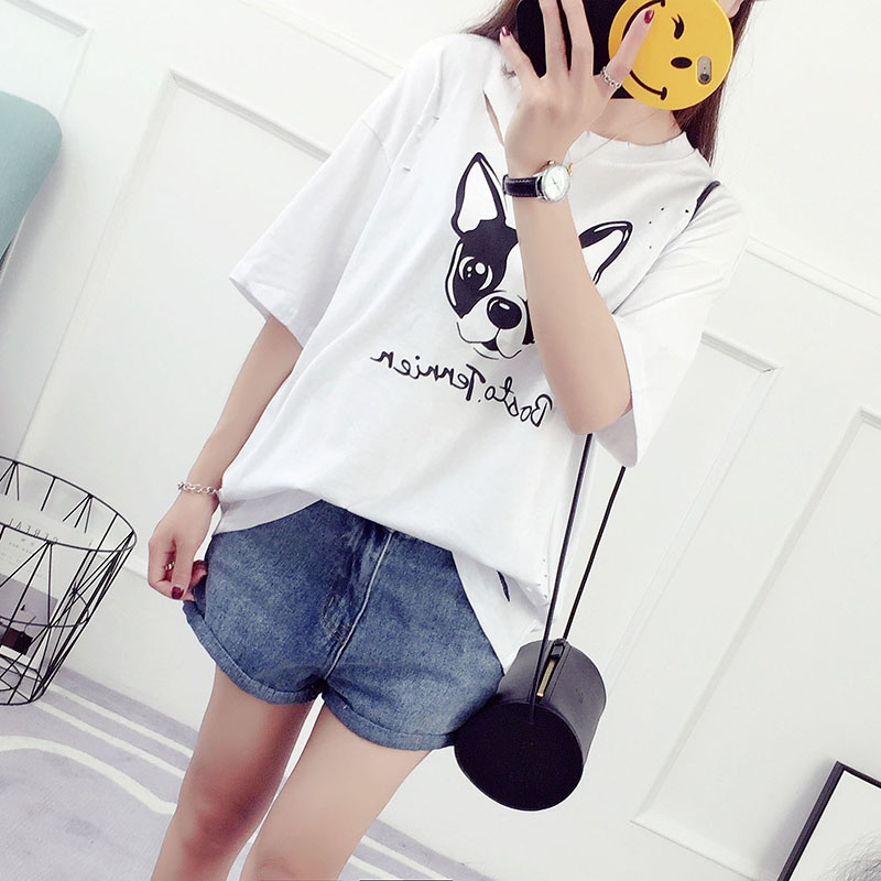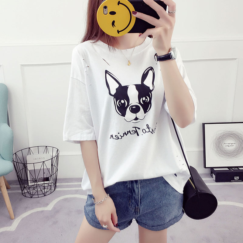 新款夏裝韓版潮學生百搭寬松破洞t恤女短袖卡通半袖休閑顯瘦