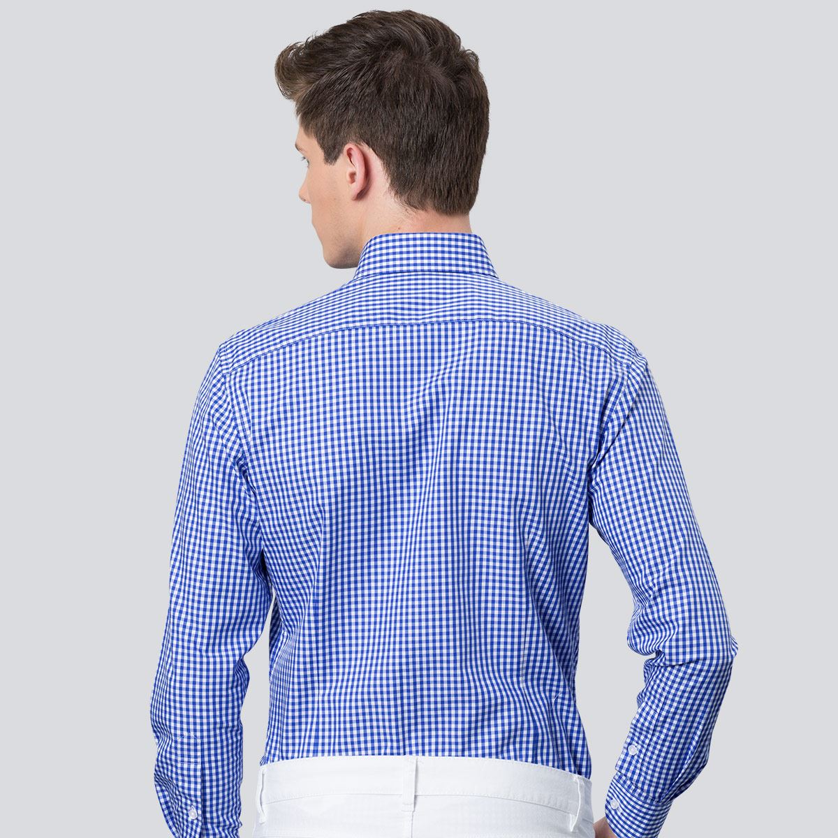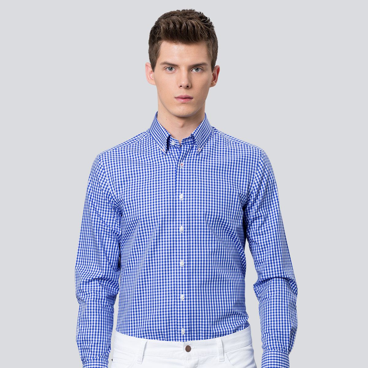 / 秋季藍白小格子男士長袖襯衫高支棉修身免燙韓版正裝釘扣領男襯衣