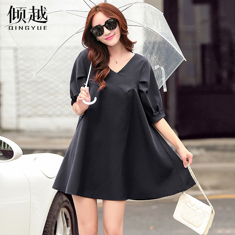 / 傾越2017夏裝新款短袖雪紡V領大碼氣質修身中長款收腰系帶連衣裙