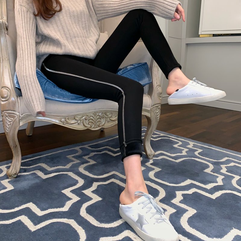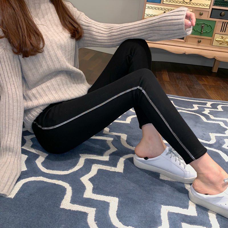 / 褲子女秋冬新款chic港味復古修身顯瘦白邊加絨打底褲九分小腳褲潮