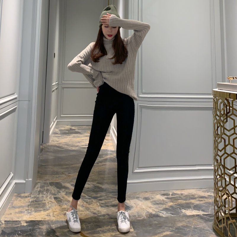 褲子女秋冬新款chic港味復古修身顯瘦白邊加絨打底褲九分小腳褲潮