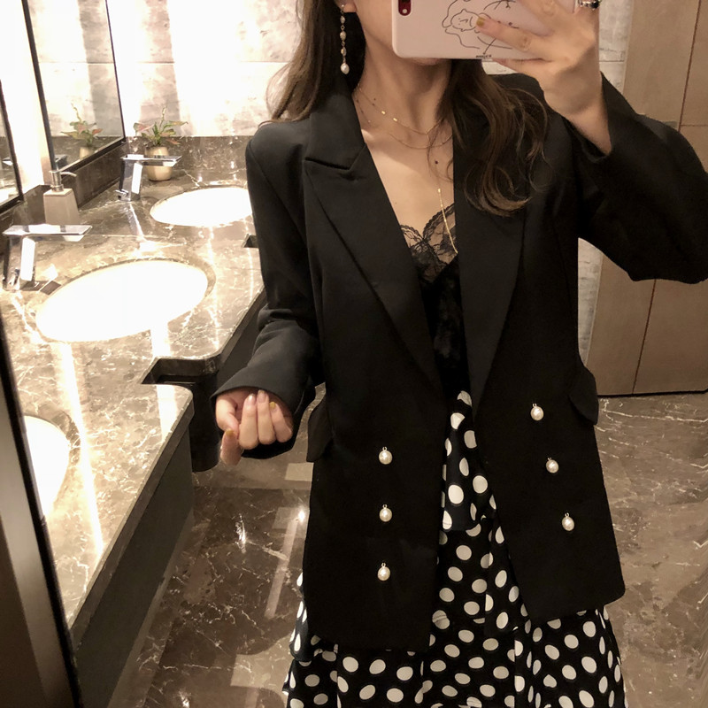 / 2018秋裝新款韓版套裝女珍珠扣西裝外套前短后長波點蛋糕裙兩件套