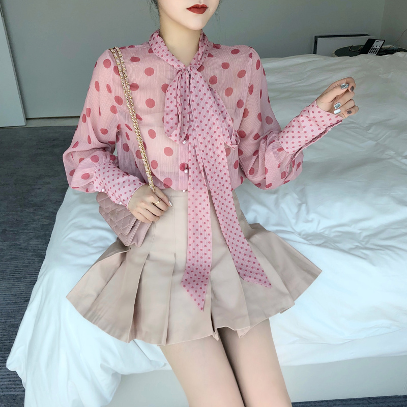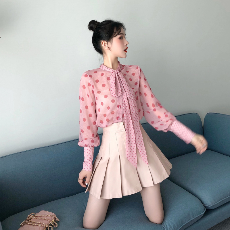/ 秋冬新款泡泡袖蝴蝶結領波點雪紡上衣高腰A字百褶半裙時尚套裝女