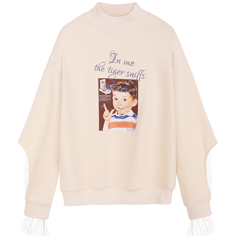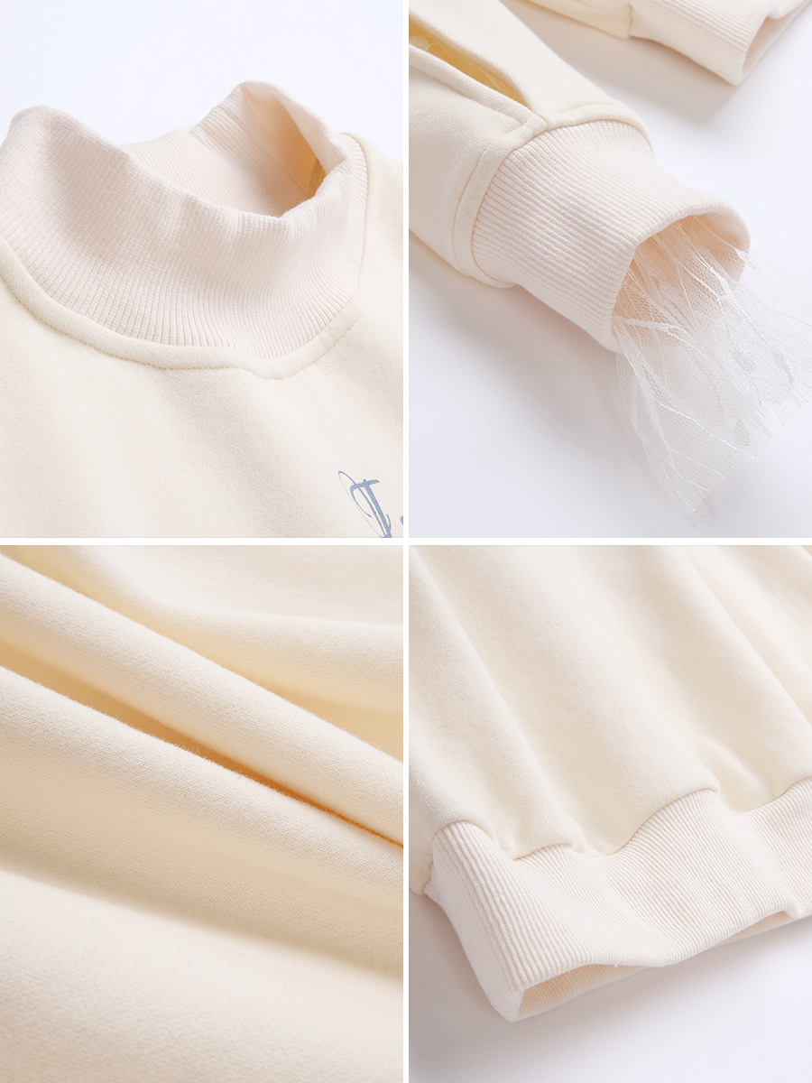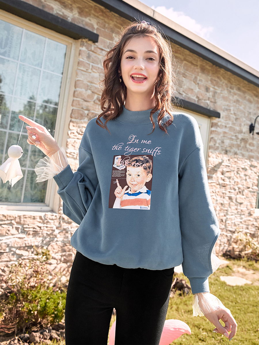 / MG小象加絨衛衣女秋冬新款蕾絲拼接寬松半高領套頭復古chic上衣潮