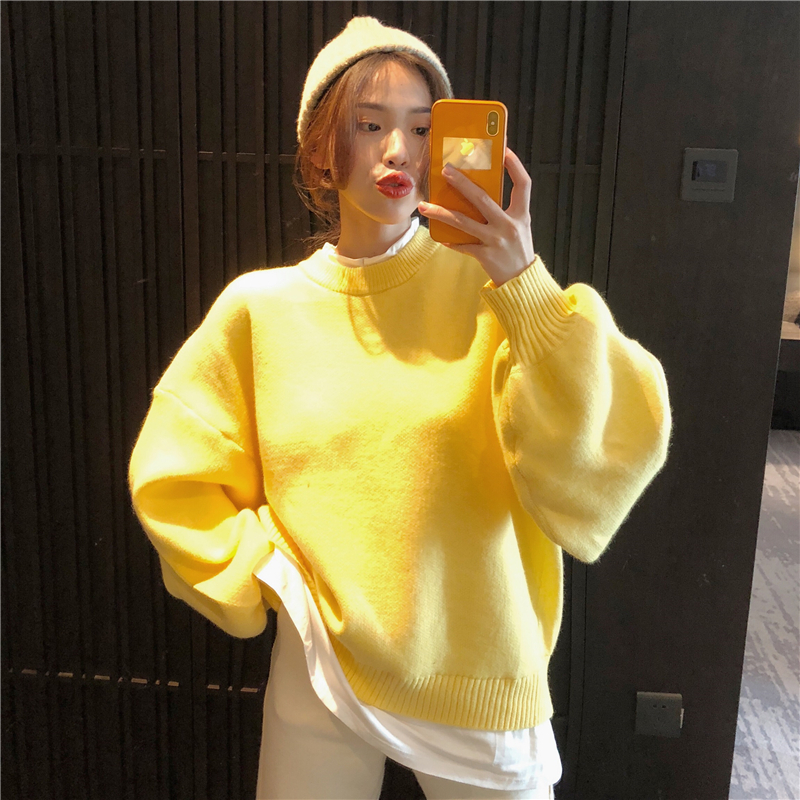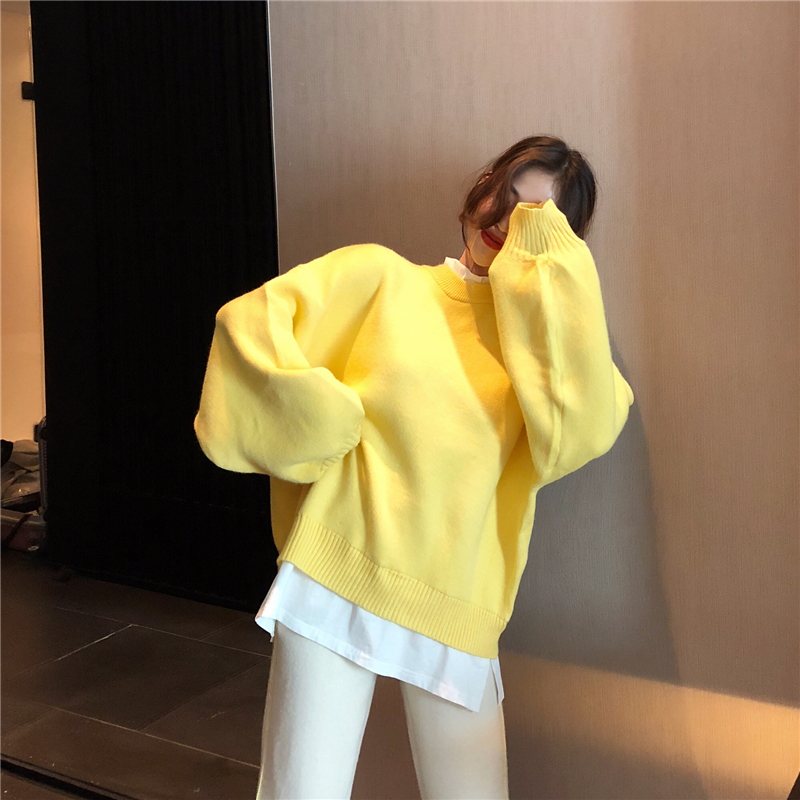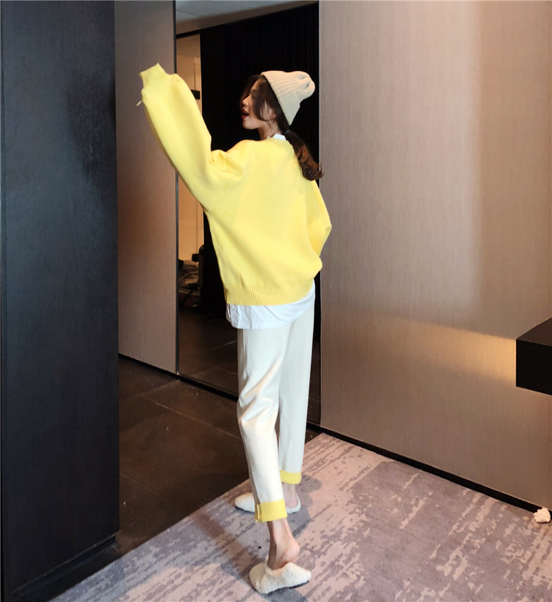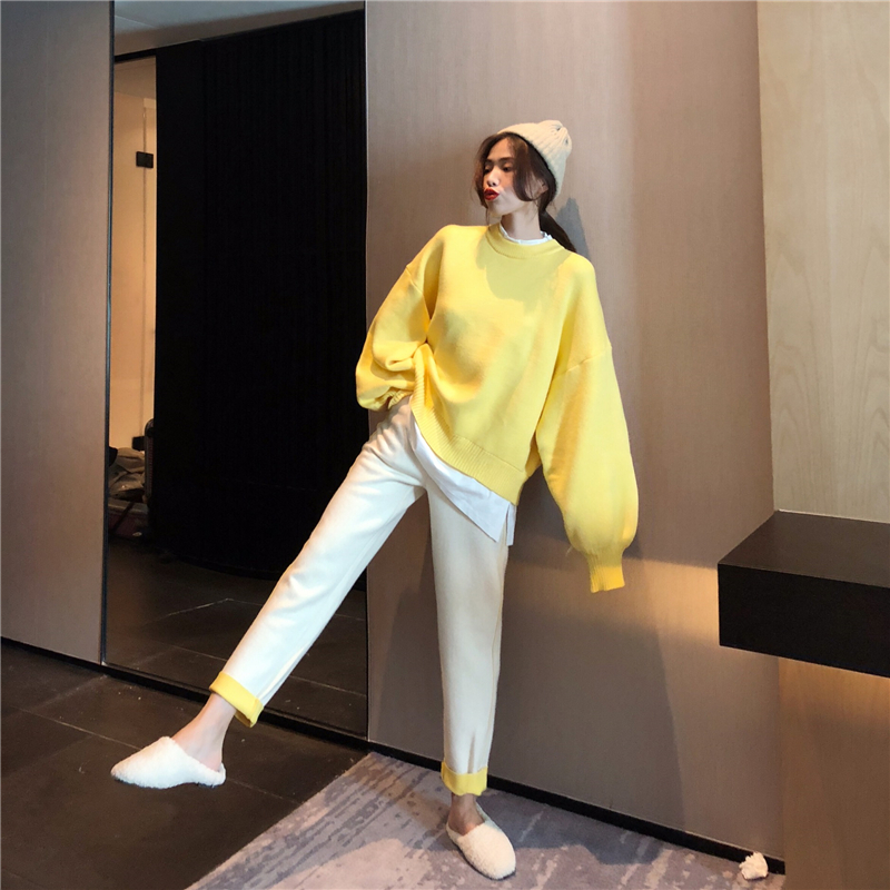/ 新款秋冬燈籠袖假兩件拼接毛衣時尚套裝撞色復合寬松蘿卜褲兩件套