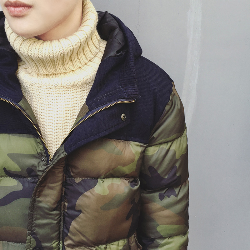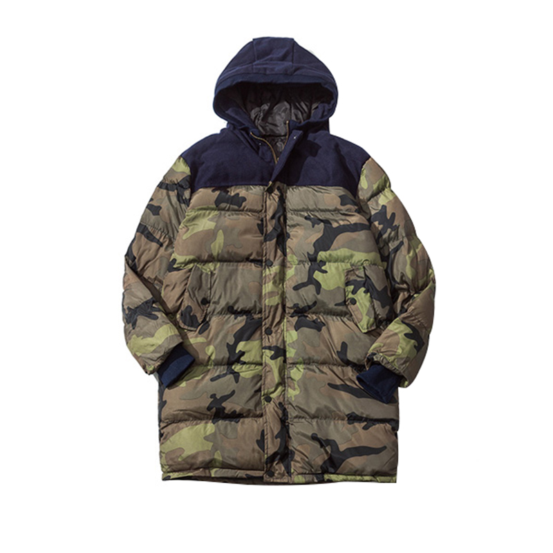 / 男裝新款韓版拼接迷彩長款連帽保暖加厚棉衣外套男