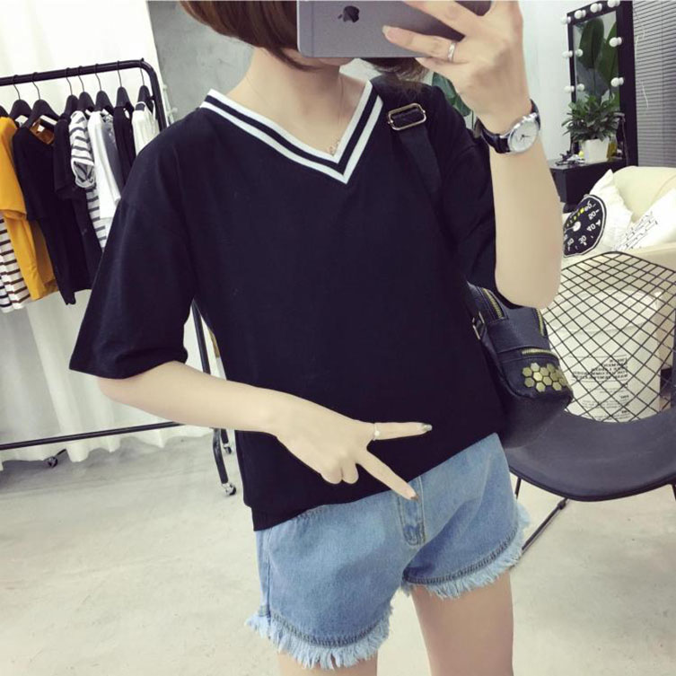/ 春夏韓版黑色V領女裝上衣寬松短袖t恤女新款學生簡約套頭T恤