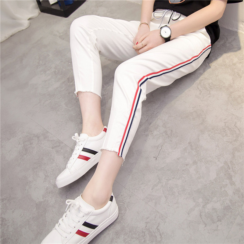 / 休閑褲女裝夏裝時尚新款白色九分褲寬松顯瘦條紋低腰小腳褲潮