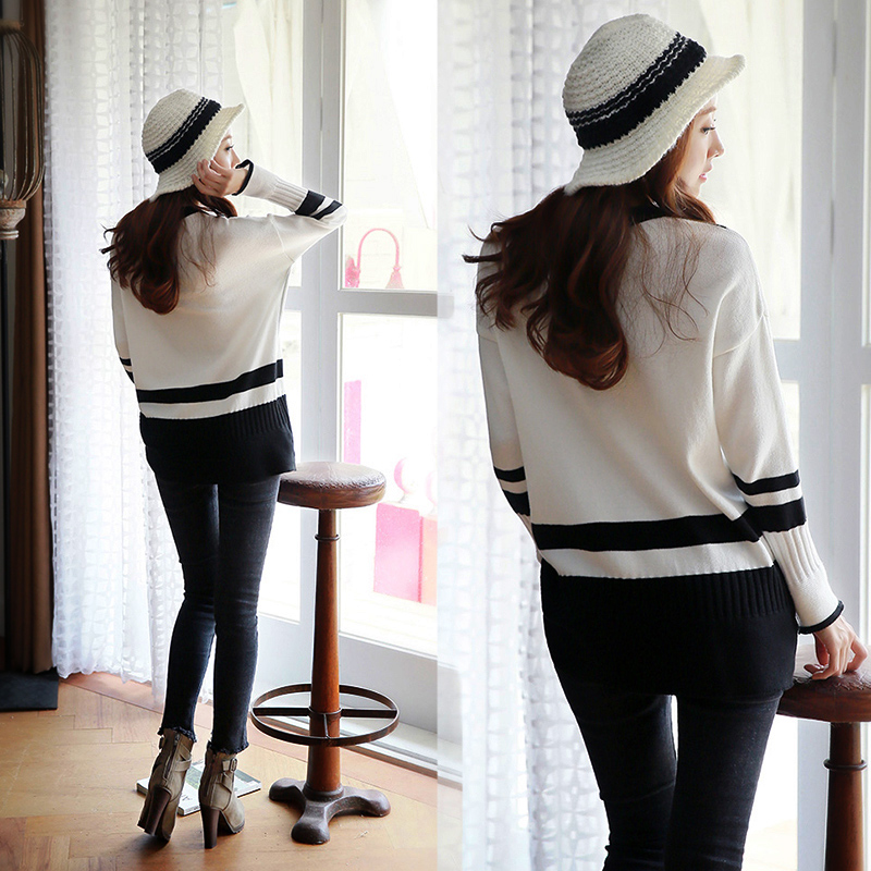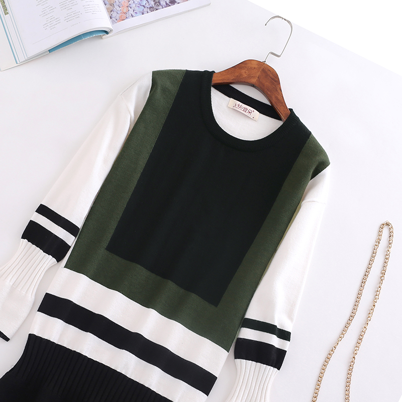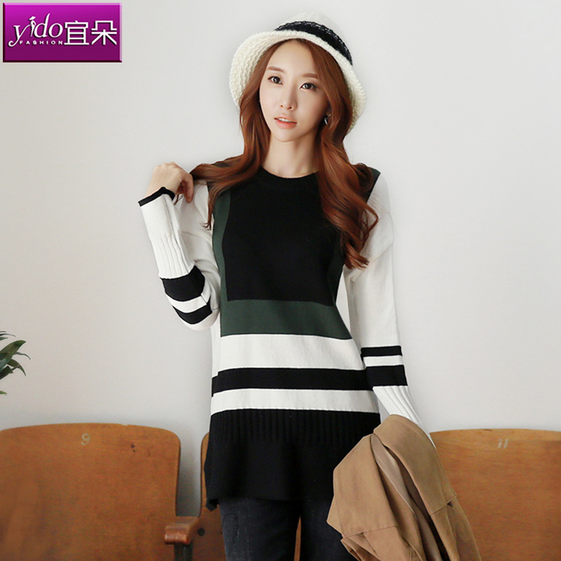 中長款撞色毛衣女秋冬新款寬松套頭圓領學院風針織打底衫外穿毛衣