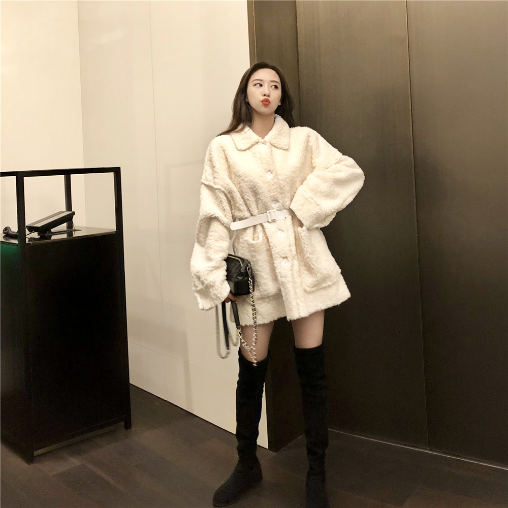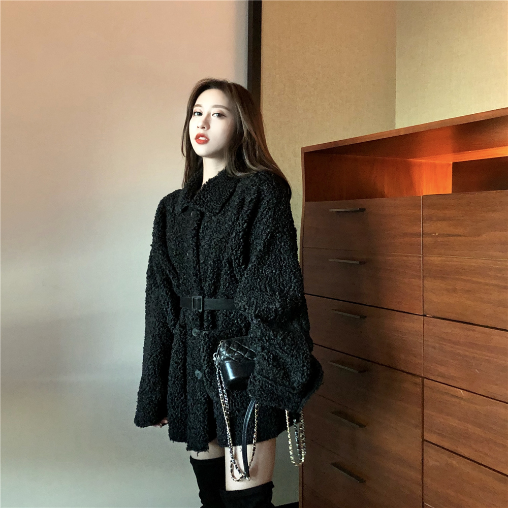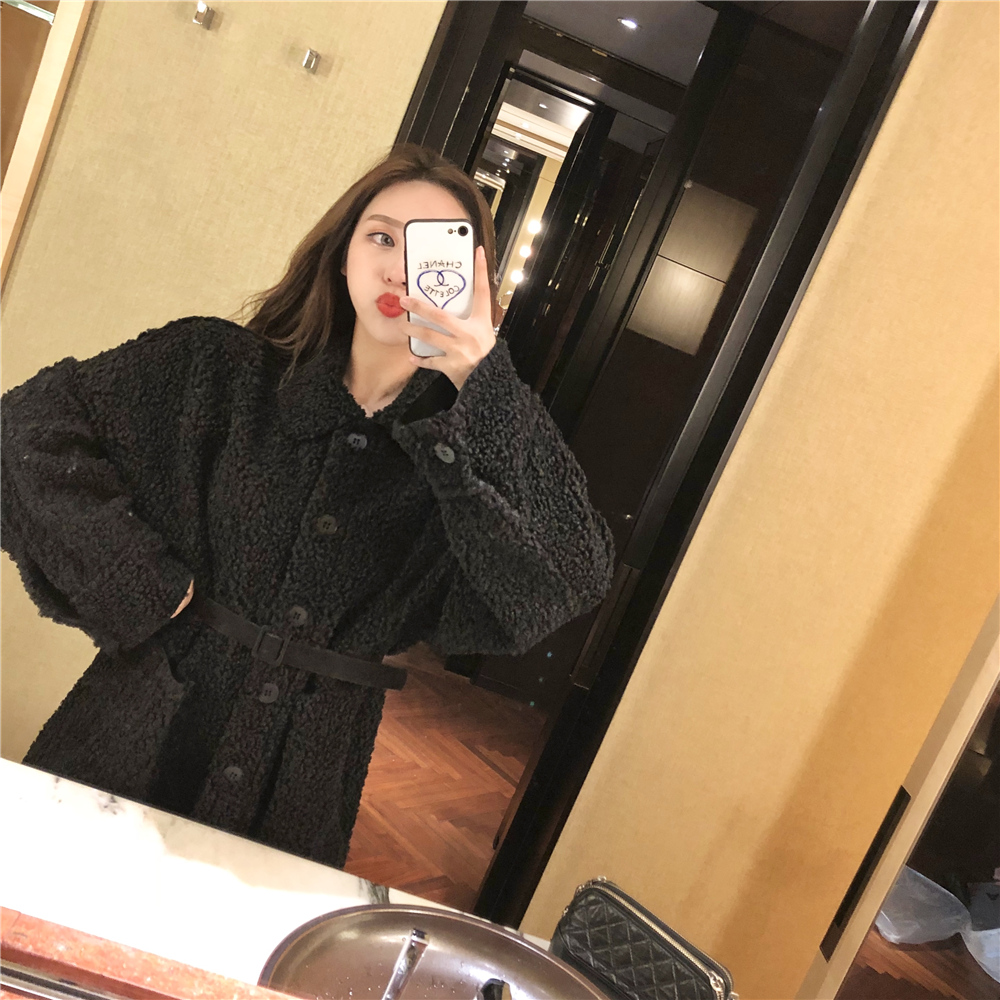 寬松加絨保暖時尚新款韓版百搭復古口袋系帶顯瘦翻領中長款外套女