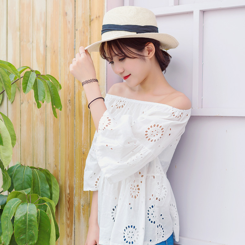 / 韓版夏裝新款女裝蕾絲鉤花鏤空雪紡衫女一字領露肩白色上衣潮