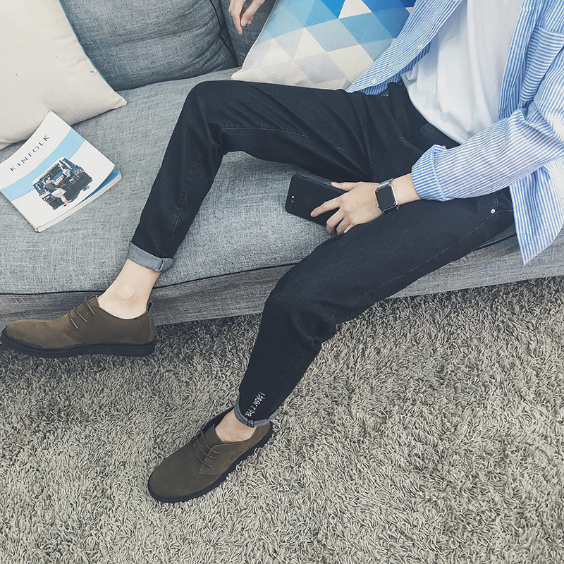 / 男裝韓版褲腳字母刺繡牛仔長褲加絨加厚修身小腳褲