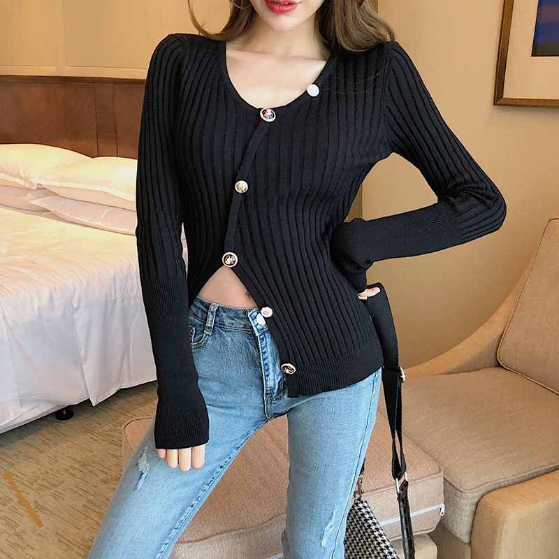 / 2018秋冬新款韓版上衣復古chic長袖純色修身顯瘦百搭單排扣針織衫
