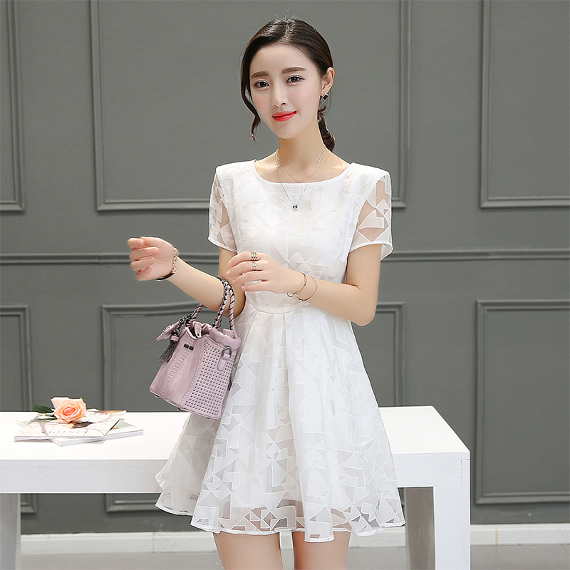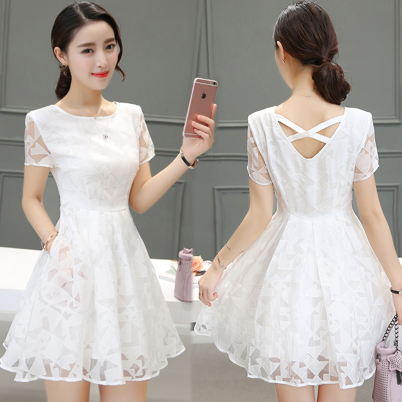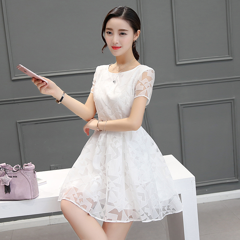 / 夏裝新款連衣裙修身韓版歐根紗短袖高腰裙子a字裙蓬蓬裙女裝