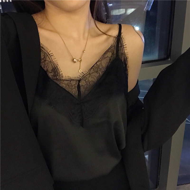 / 吊帶女新款秋季chic復古時尚百搭寬松內搭顯瘦純色蕾絲打底小背心