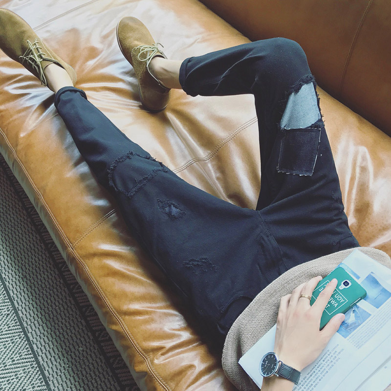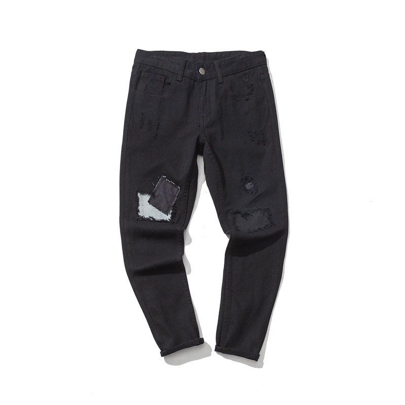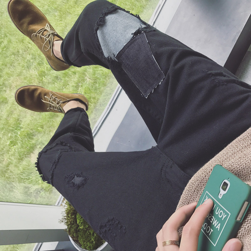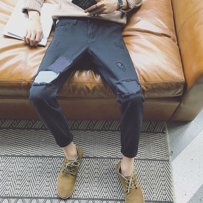 / 男裝破洞補丁個性休閑褲韓版修身小腳男士低襠垮褲