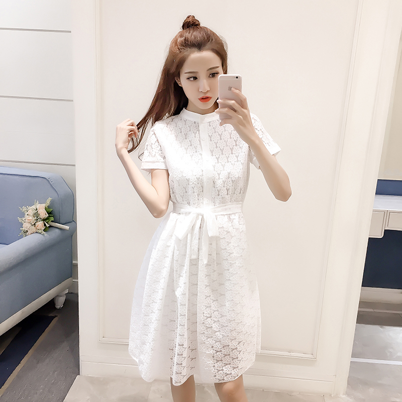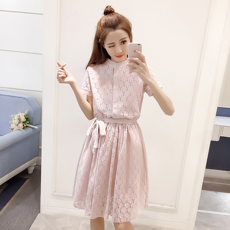 / 新款女裝韓版中長款收腰a字裙子修身短袖蕾絲襯衫連衣裙女夏