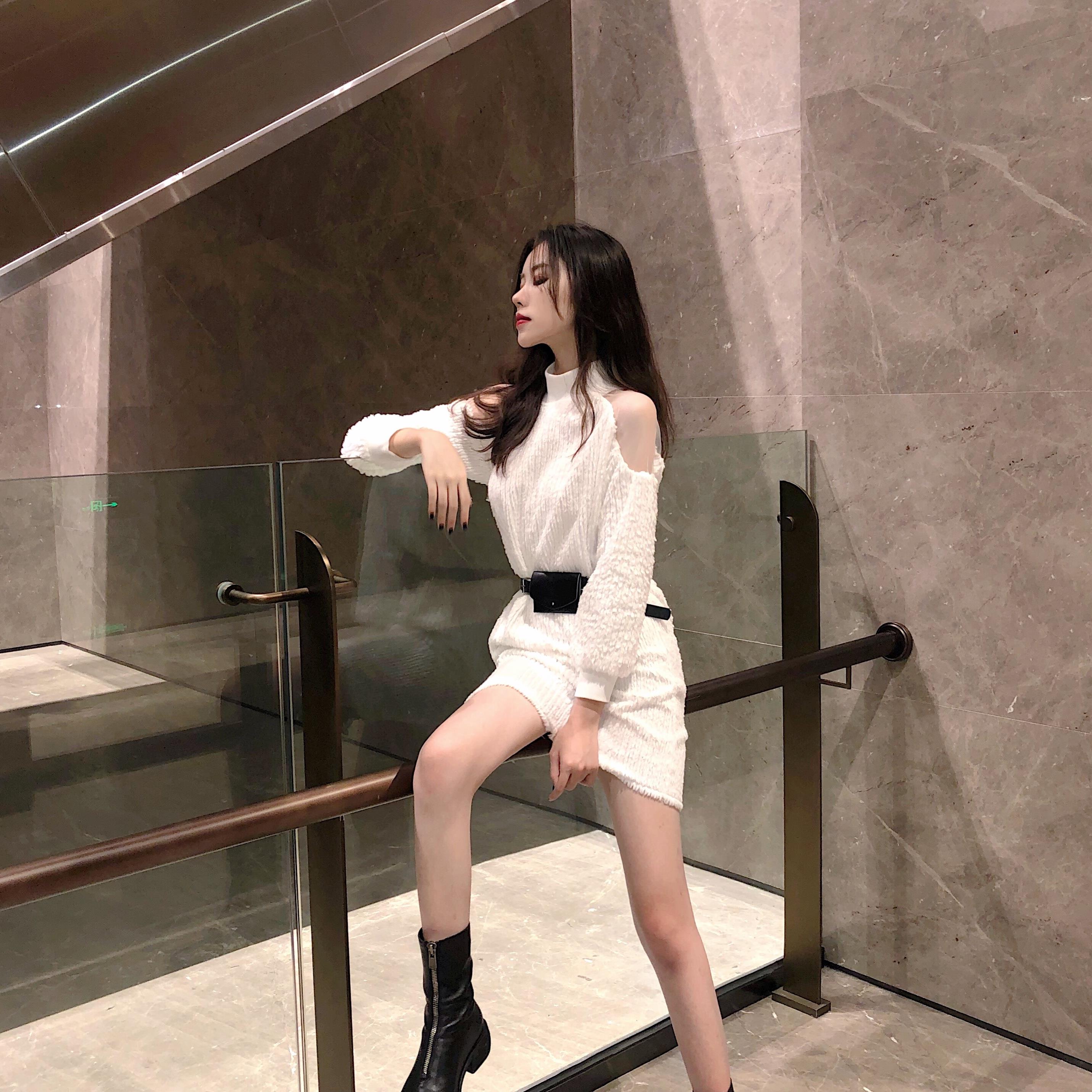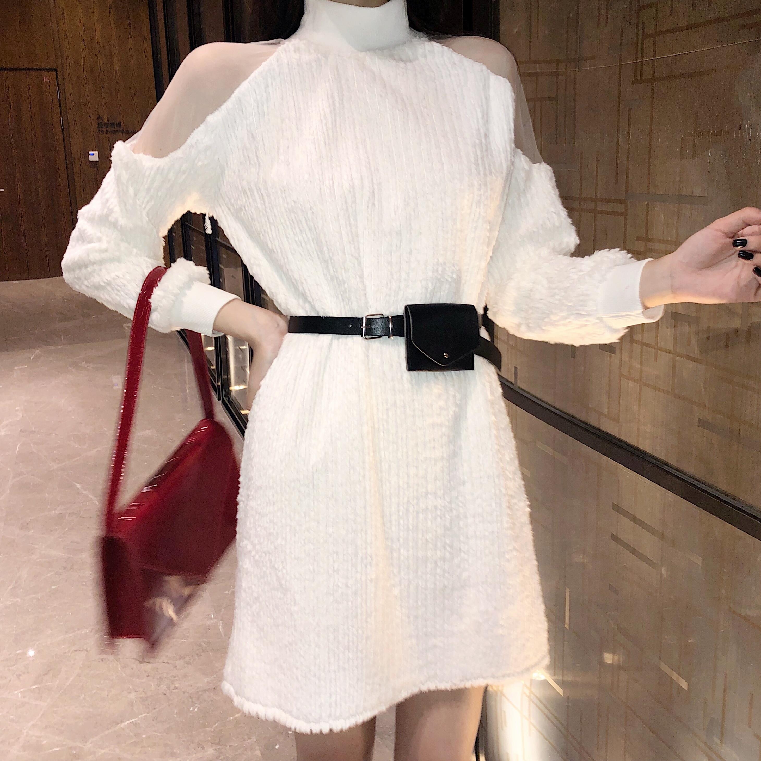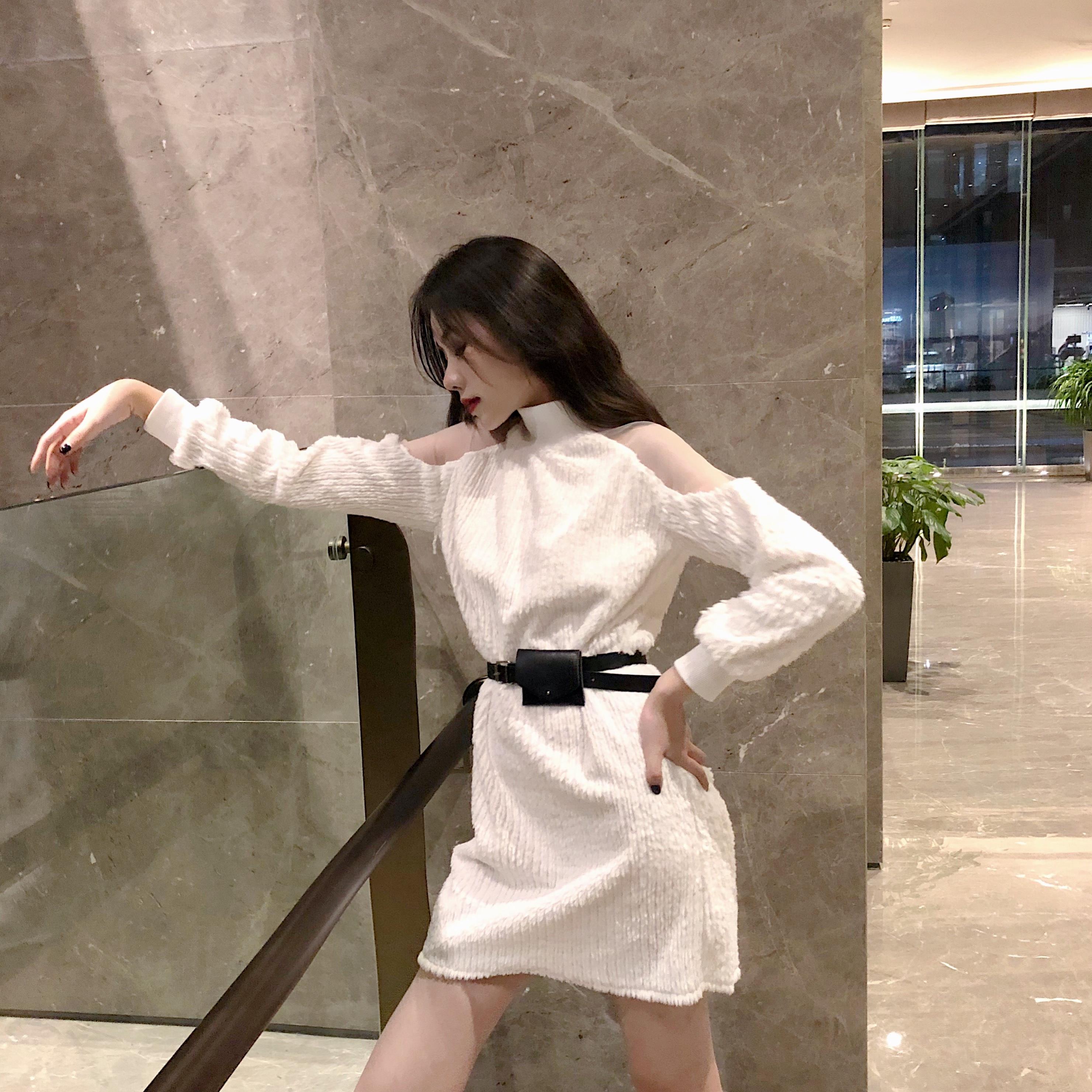 港味氣質圓領網紗拼接露肩掛脖長袖顯瘦連衣裙