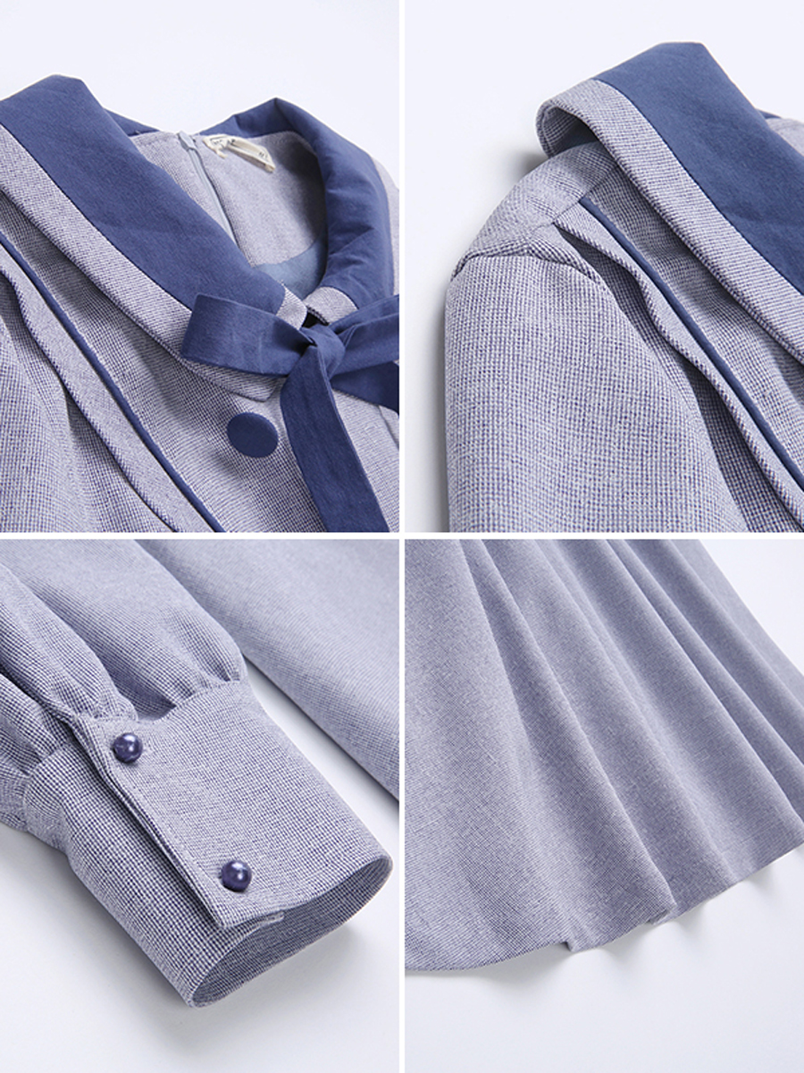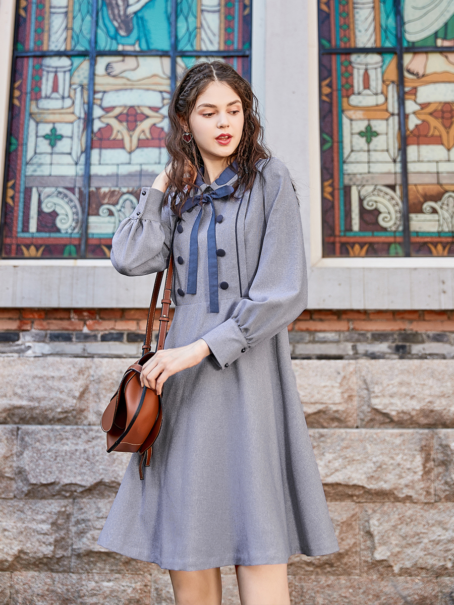 MG小象港味復古連衣裙女中長款秋冬新款寬松蝴蝶結長袖氣質裙子潮