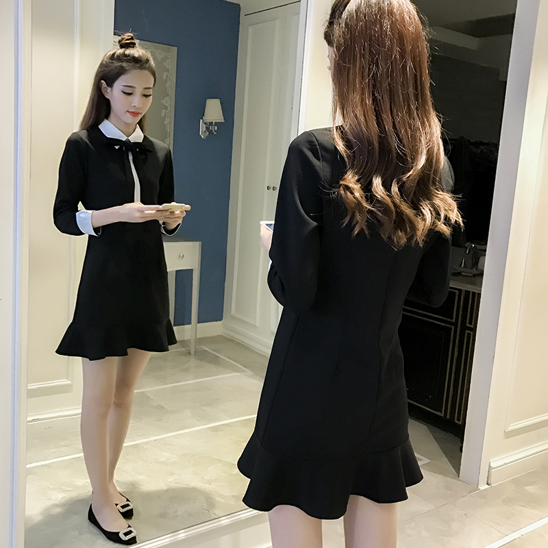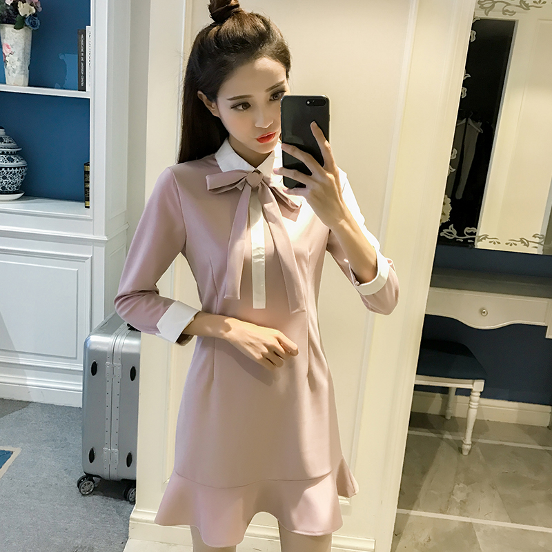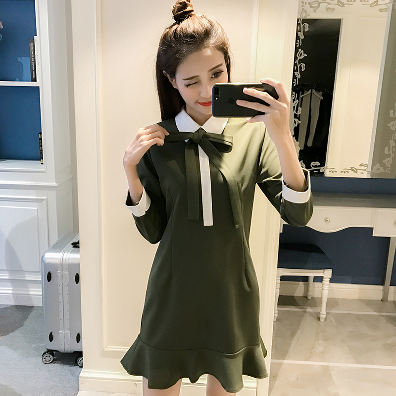 / 春裝新款韓版蝴蝶結娃娃領修身長袖連衣裙女秋冬荷葉邊打底裙