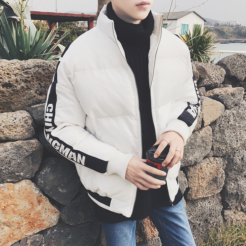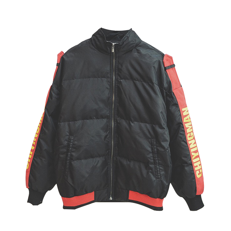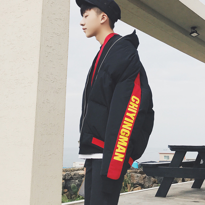新款冬裝港系加厚袖帶印花撞色男士寬松版棉衣外套