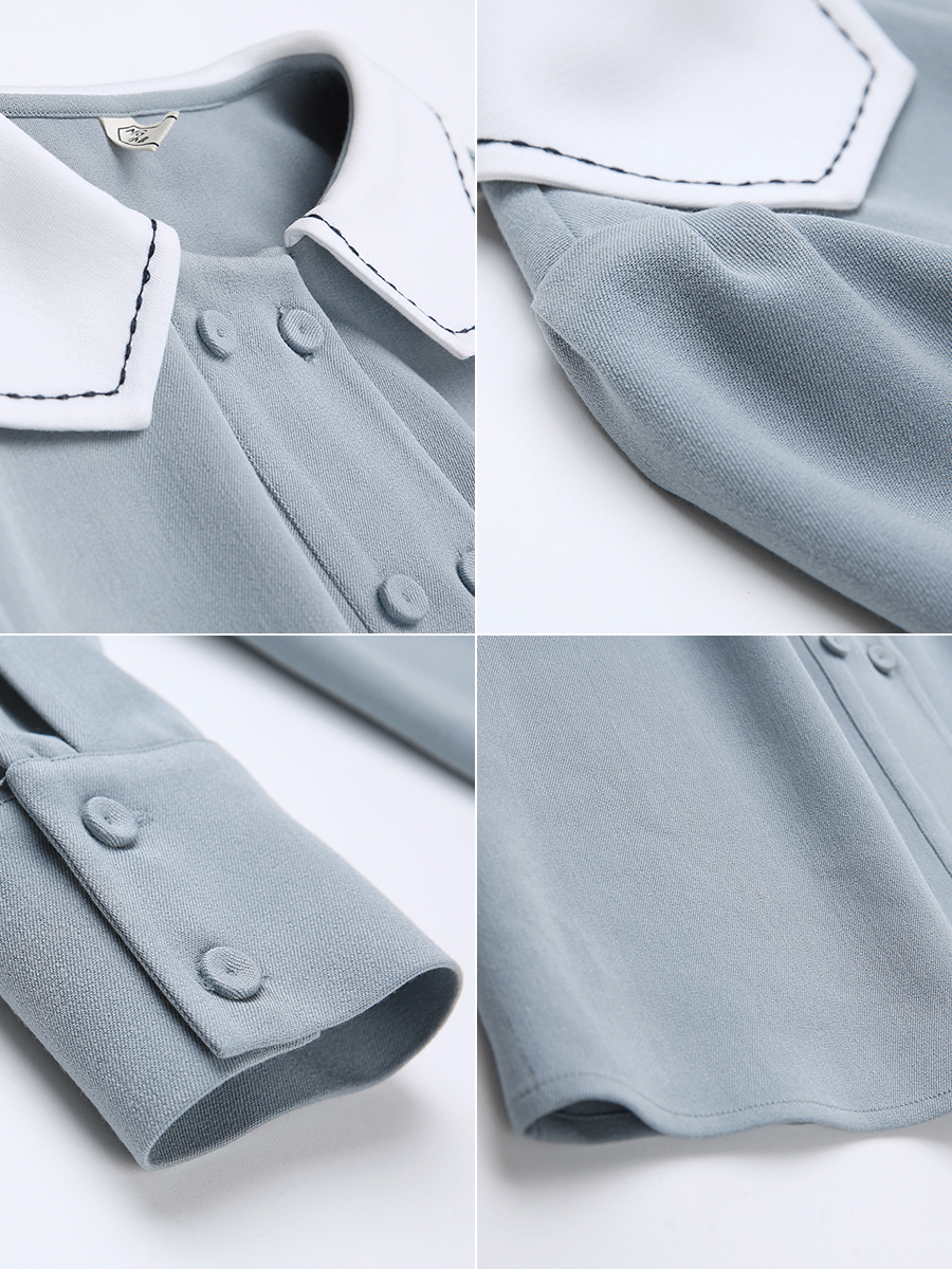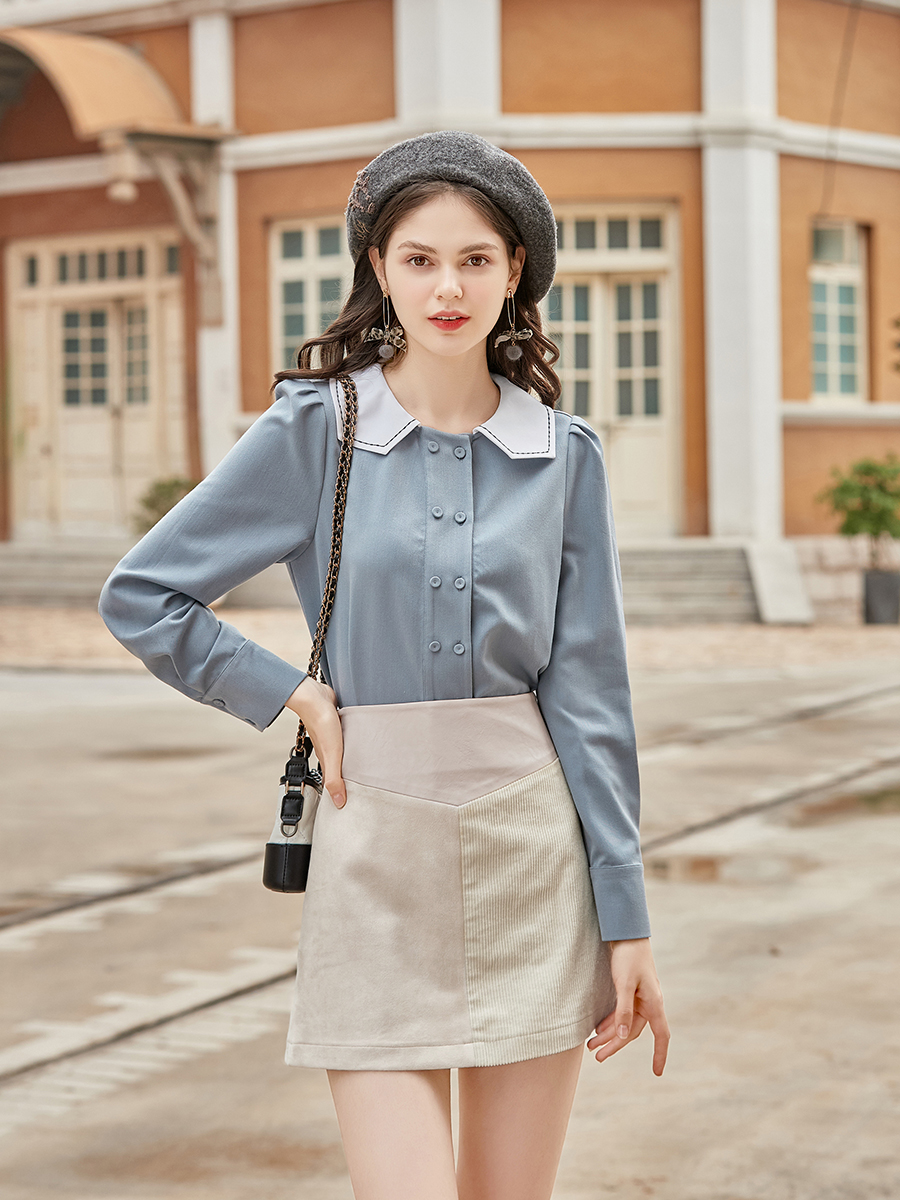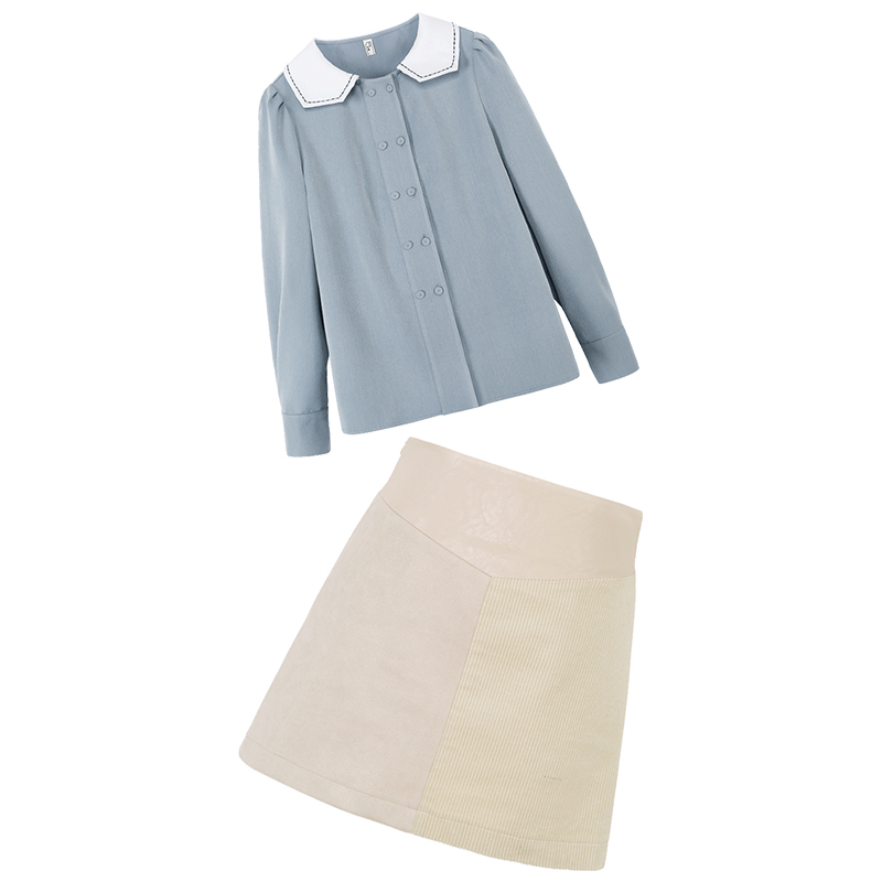 MG小象小清新藍色襯衫女冬季短款高腰半身裙2018新款寬松學生上衣