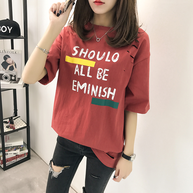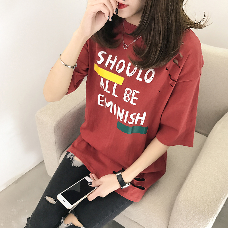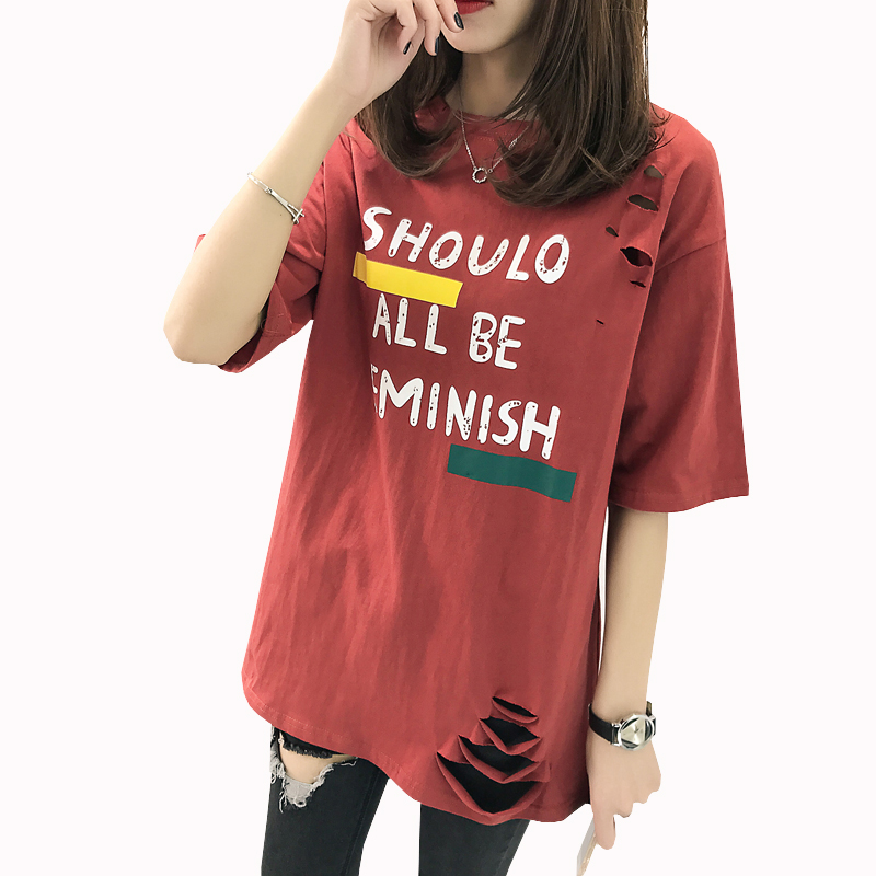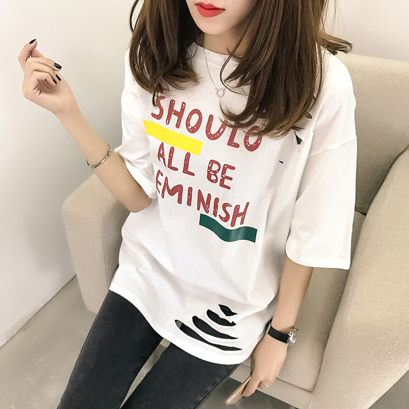 / 春裝新款韓版學生印花破洞短袖T恤女夏季寬松中長款打底上衣