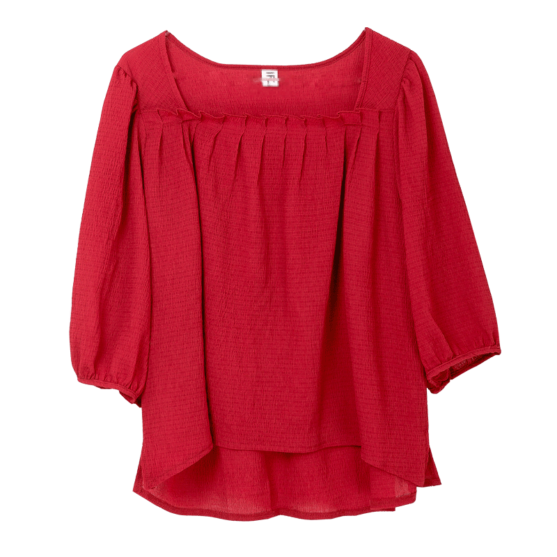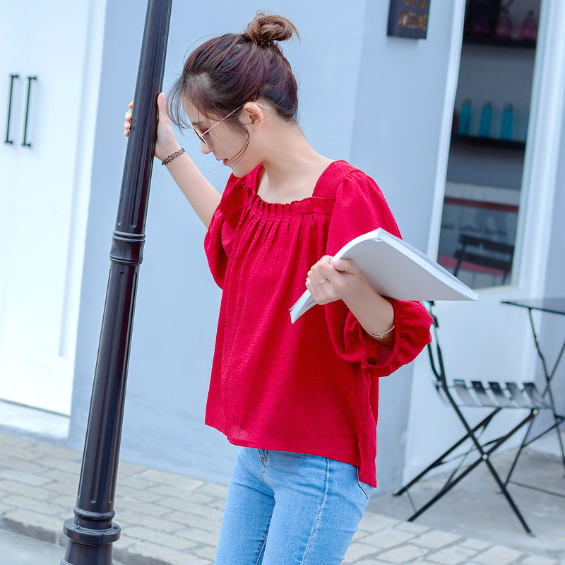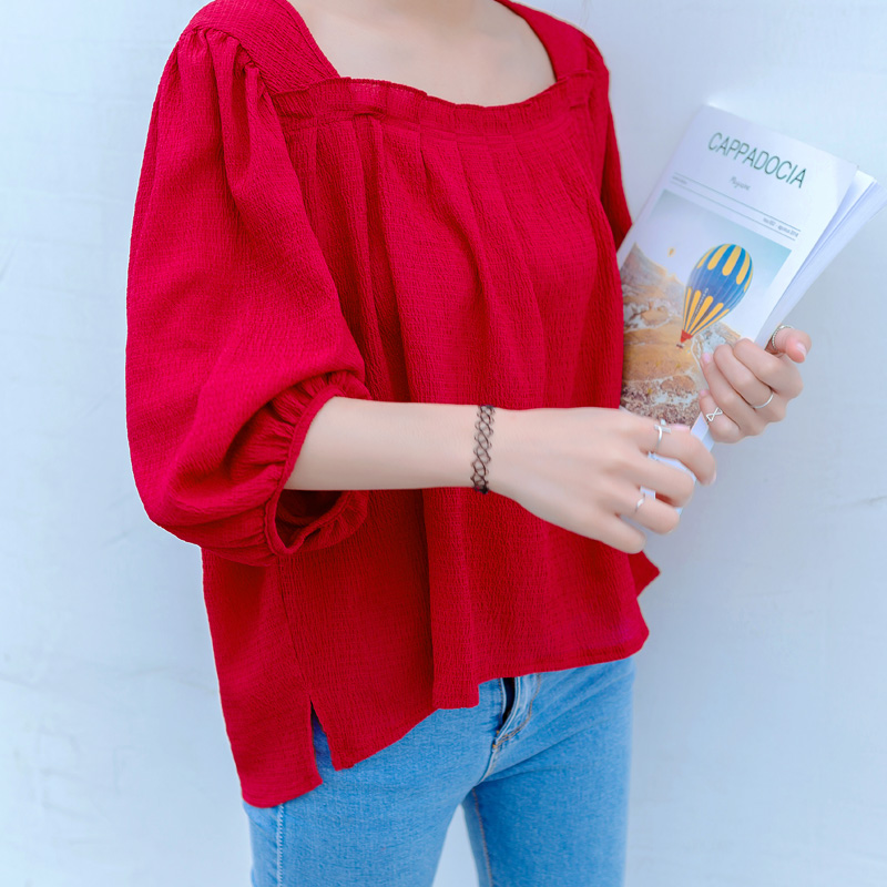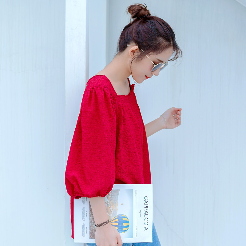 / 夏裝新款韓版女裝燈籠袖雪紡衫紅色復古百搭半袖短款上衣女潮