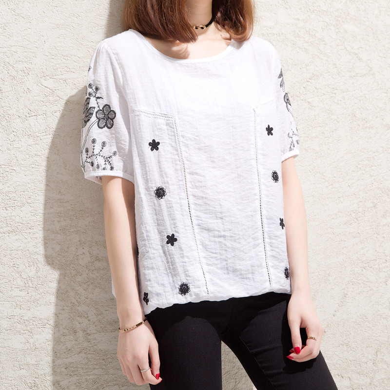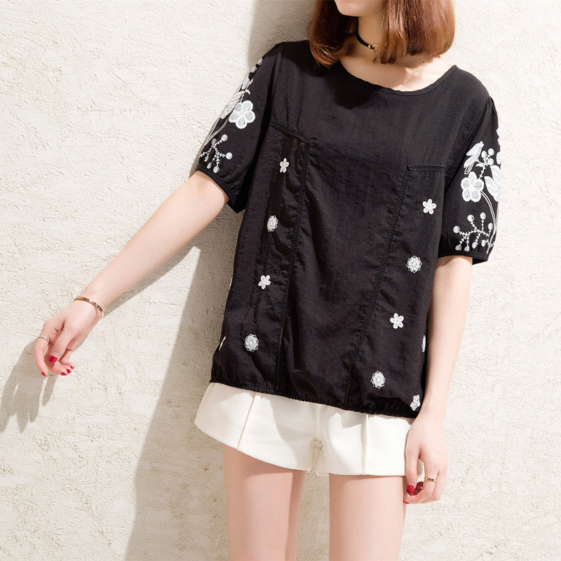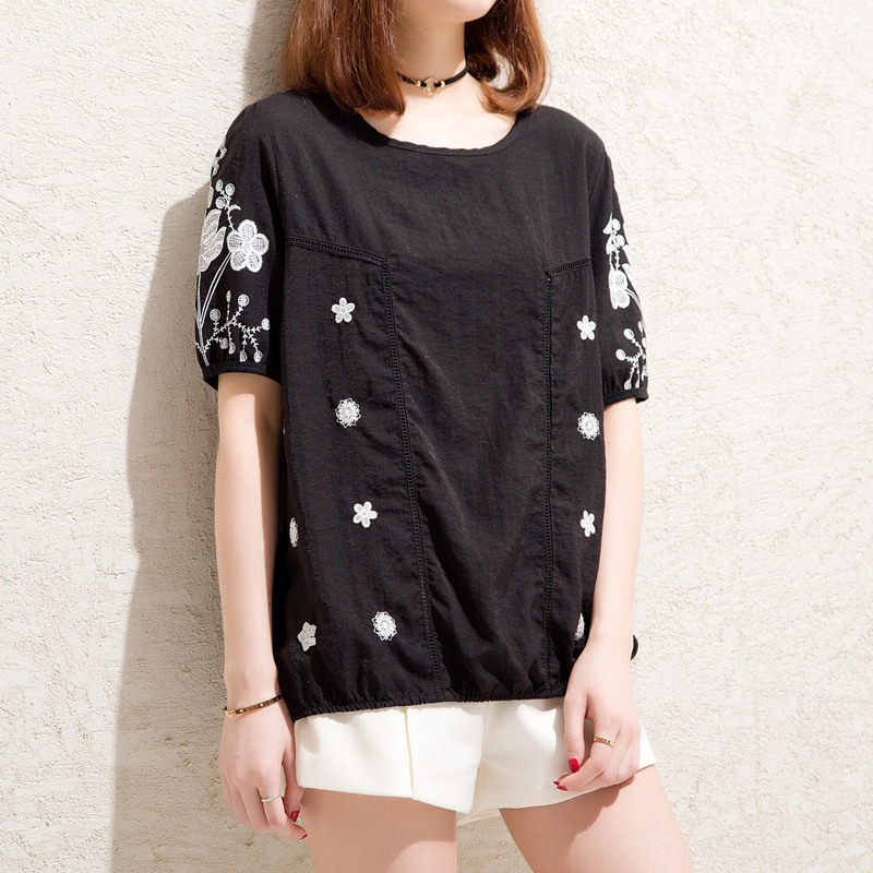/ 短袖t恤女心機上衣服寬松名族風刺繡bf風黑色體恤女夏裝新款