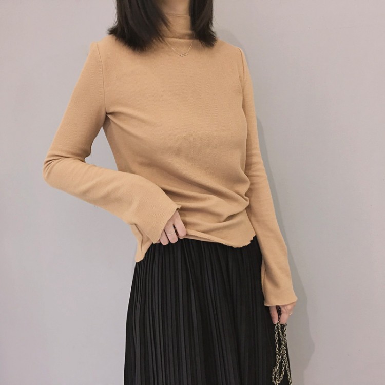 秋冬款韓國彈力質感螺紋顯瘦半高領長袖套頭打底衫修身T恤女
