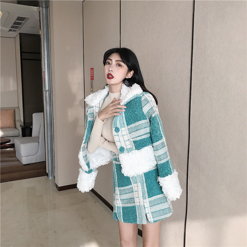 冬時尚氣質羊毛呢子短款格子毛領毛呢外套女+毛呢半身裙