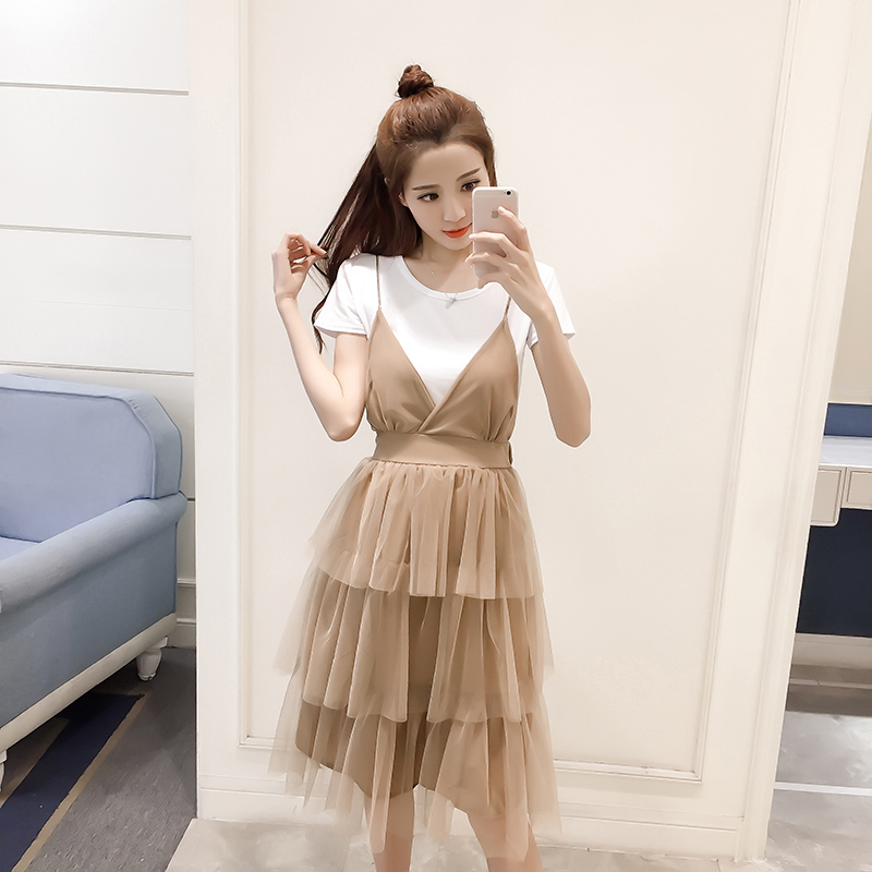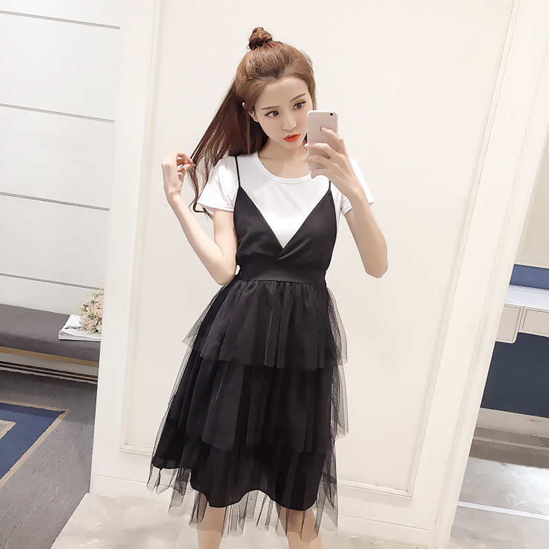 / 夏季新款女裝韓版網紗吊帶裙兩件套中長款顯瘦短袖蓬蓬連衣裙