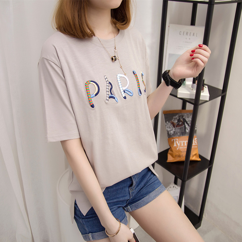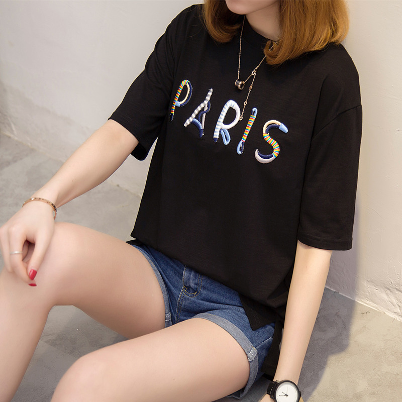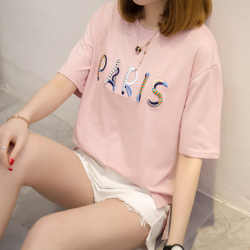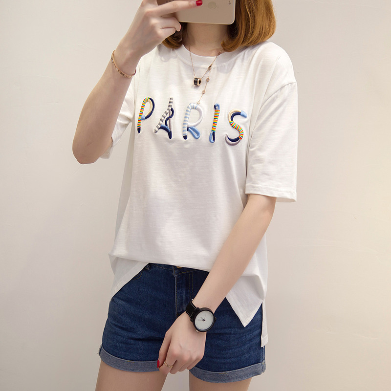 夏裝新款女上衣寬松白色t恤女韓版刺繡打底體恤衫學生百搭潮