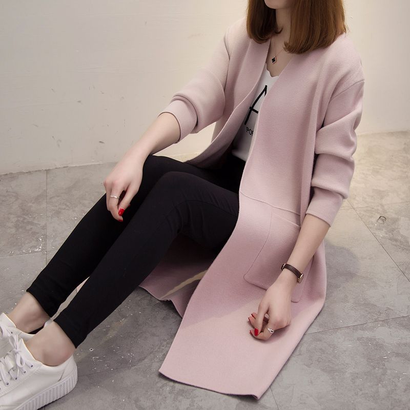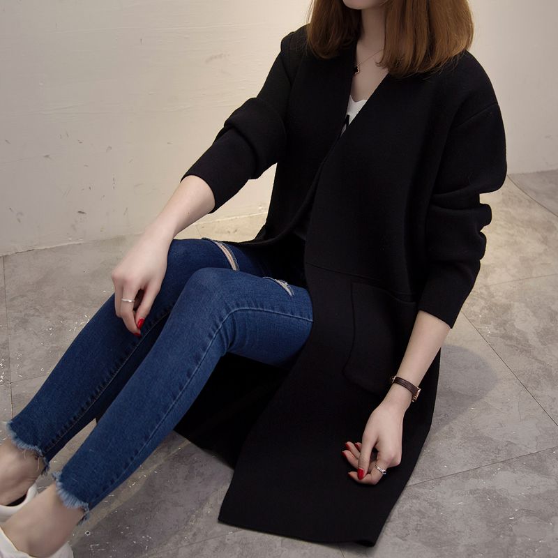 / 中長款寬松針織衫開衫韓版秋冬季新款女裝純色口袋毛衣外套女潮