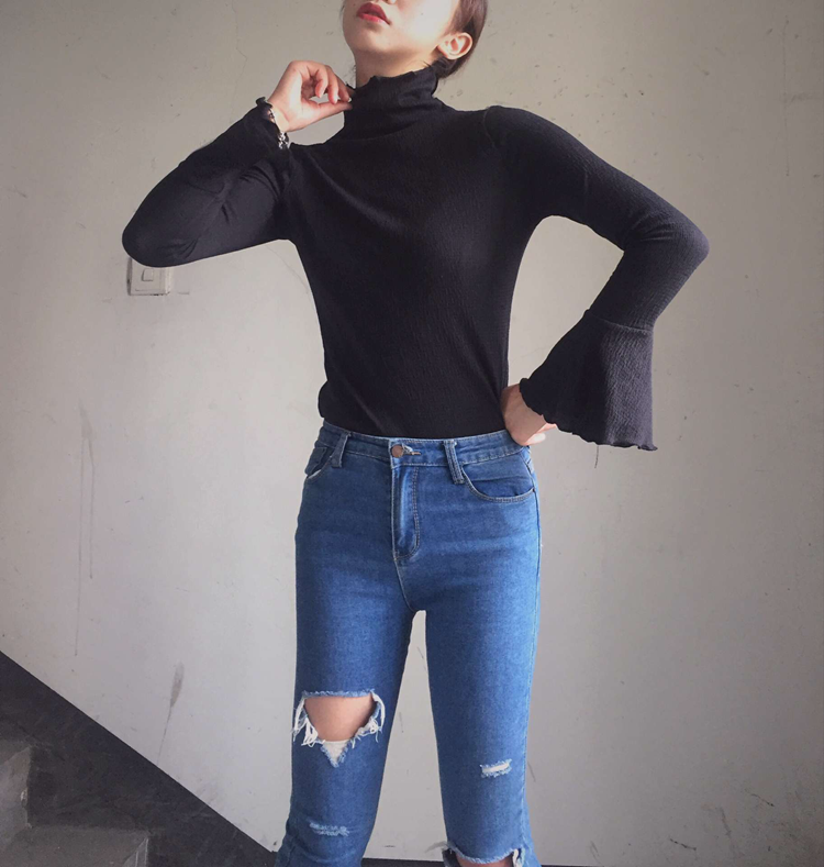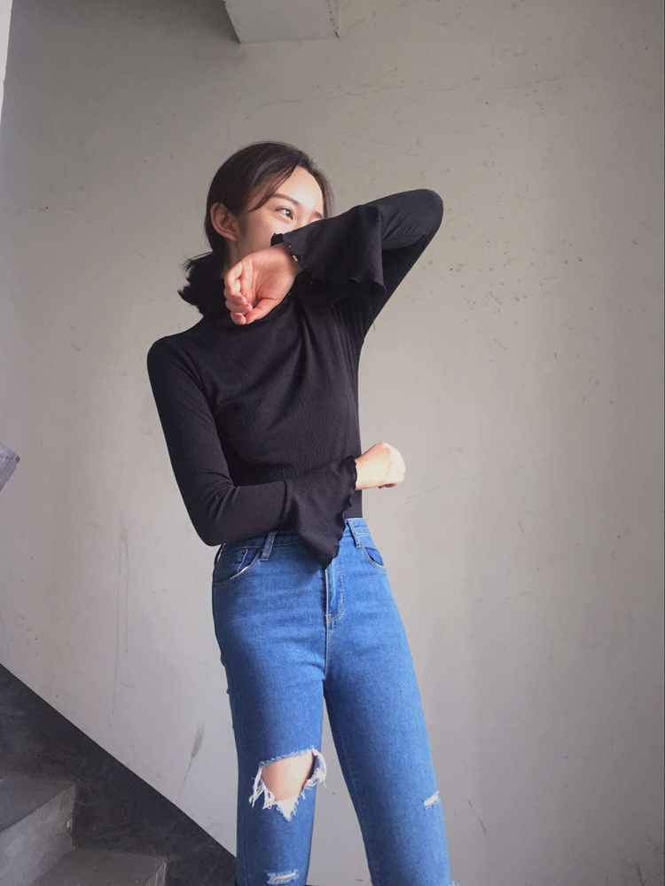 秋冬新款修身顯瘦女裝T恤上衣韓版百搭喇叭長袖套頭打底衫女