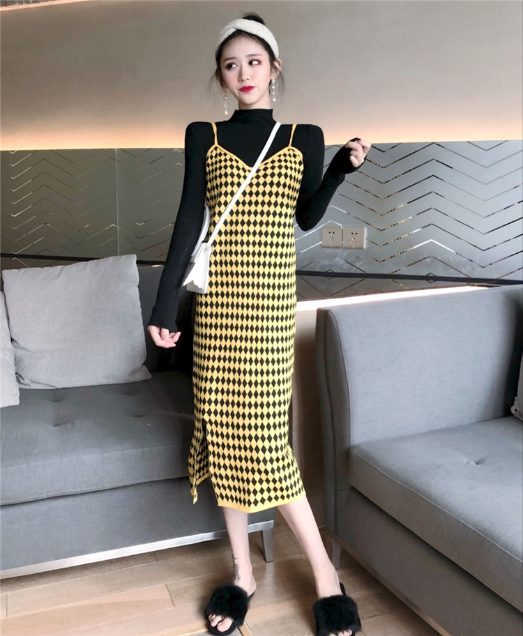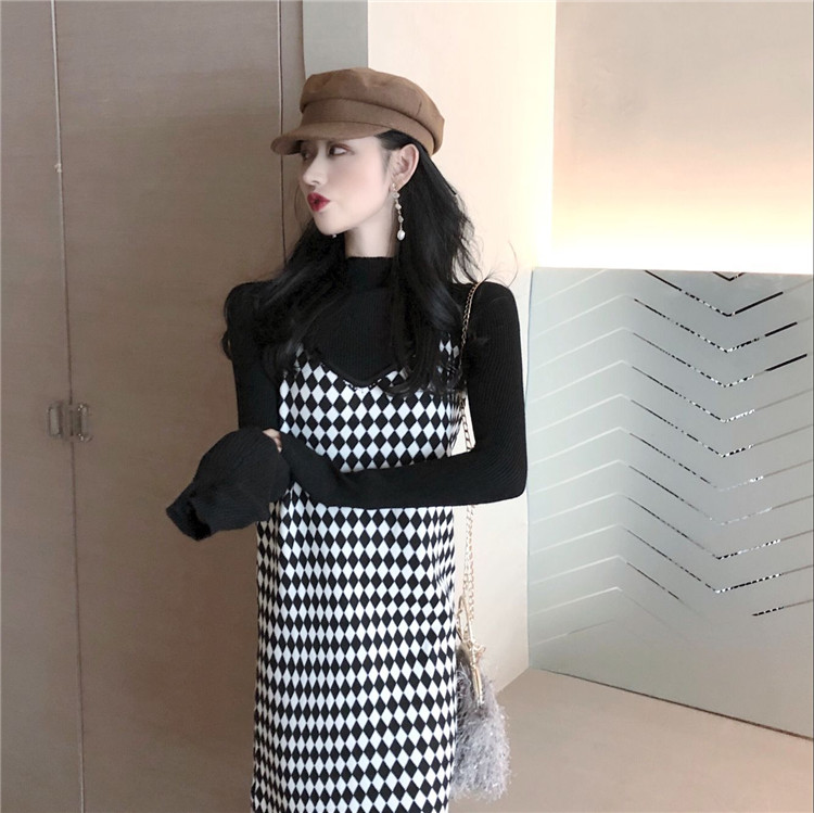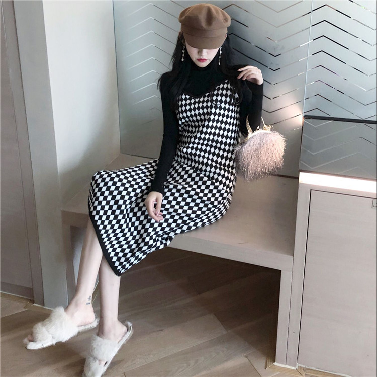 套裝女秋韓版氣質修身顯瘦半高領打底衫開叉格子吊帶長裙兩件套潮