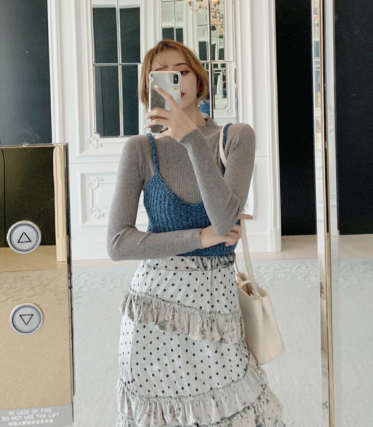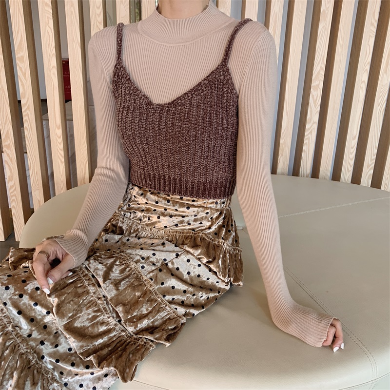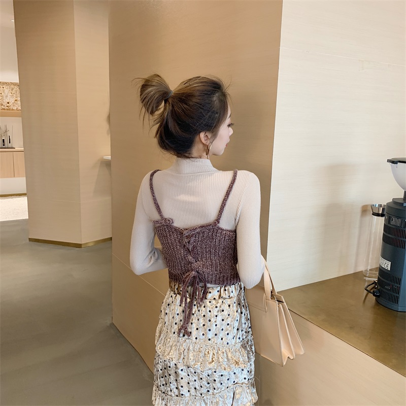/ 韓版高腰荷葉邊A字裙后背綁帶針織吊帶針織打底衫三件套時尚套裝