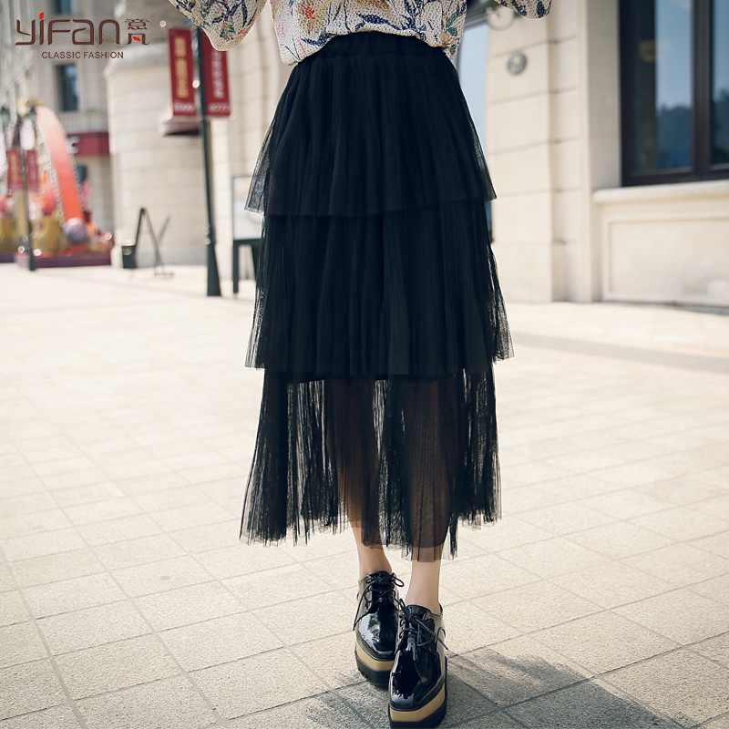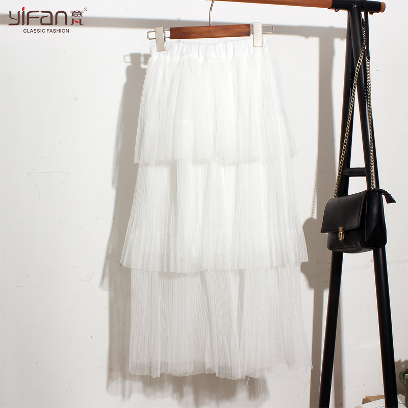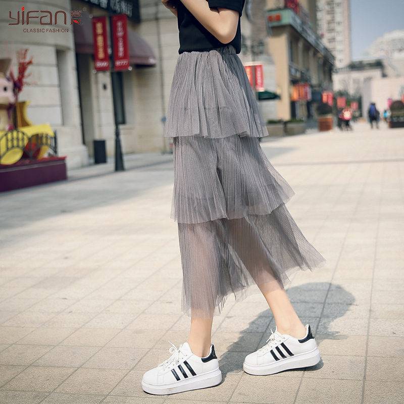 / 韓版夏裝新款紗網百褶鏤空百搭半身裙女裝大擺高腰中裙