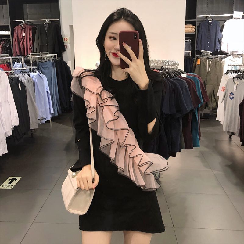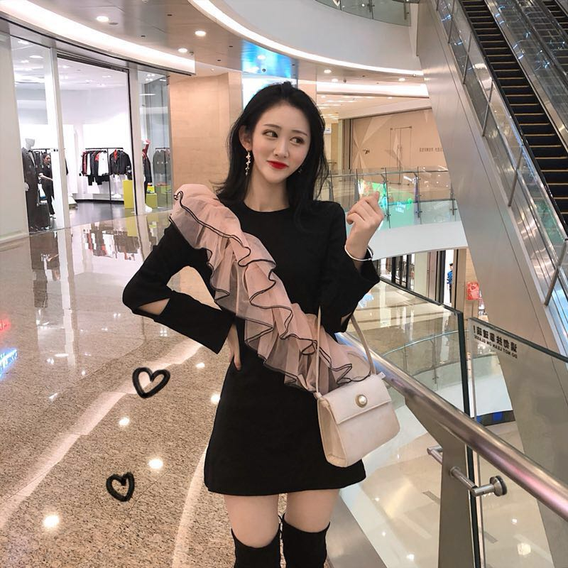 / 2018秋新品立體荷葉邊設計感時尚chic百搭復古拼接顯瘦短款連衣裙