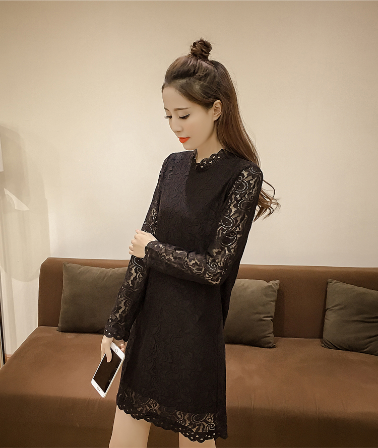 / 春裝新款女裝韓版中長款立領打底裙女顯瘦長袖蕾絲連衣裙秋冬
