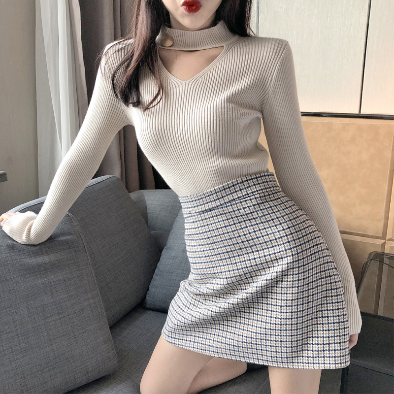 / 港味秋冬新款修身顯瘦針織衫女小心機chic套頭長袖掛脖性感打底衫