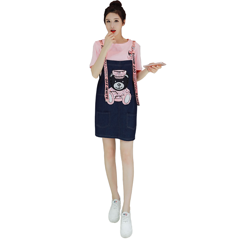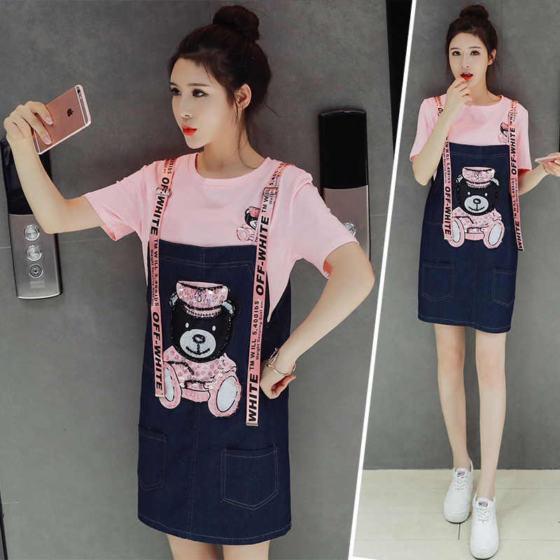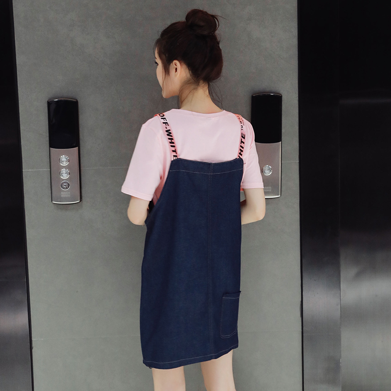 時尚套裝女夏裝新款韓版可愛學生牛仔連衣裙寬松背帶兩件套潮