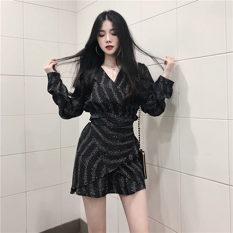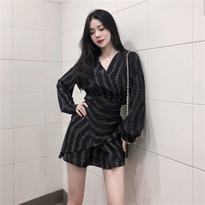 / 秋季新款時尚V領不規則荷葉邊chic綁帶星空連衣裙長袖雪紡打底裙