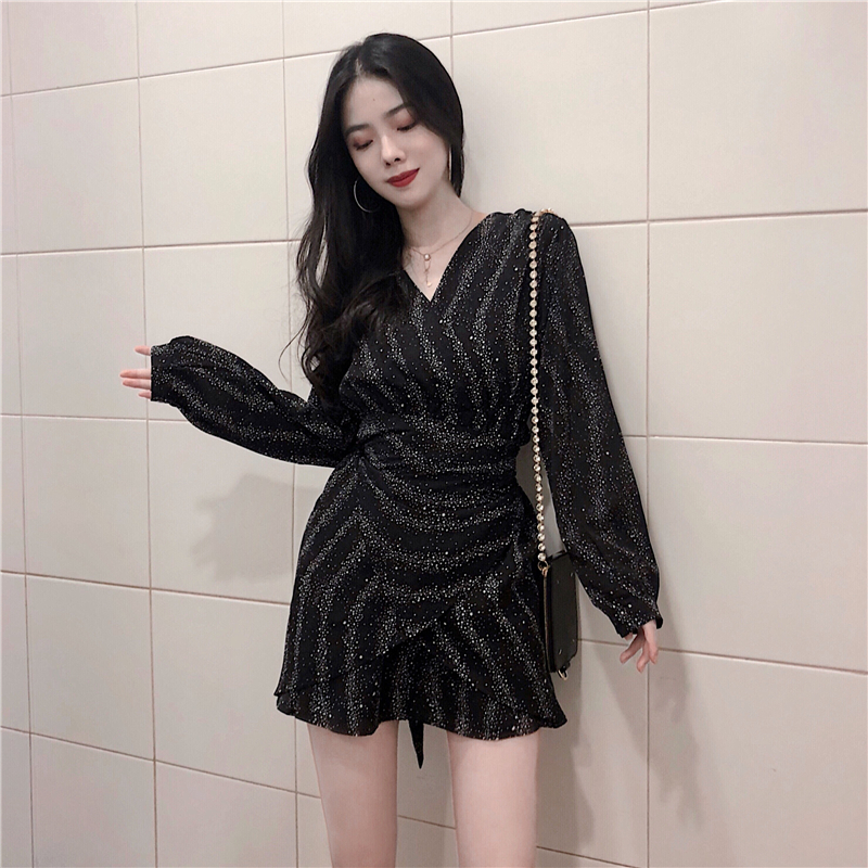 秋季新款時尚V領不規則荷葉邊chic綁帶星空連衣裙長袖雪紡打底裙