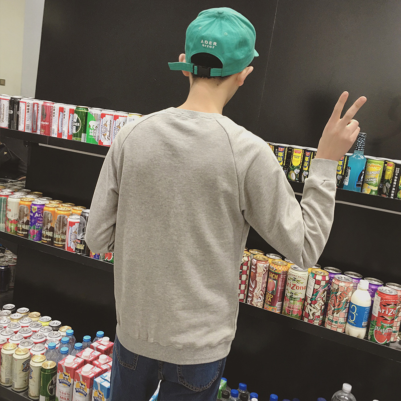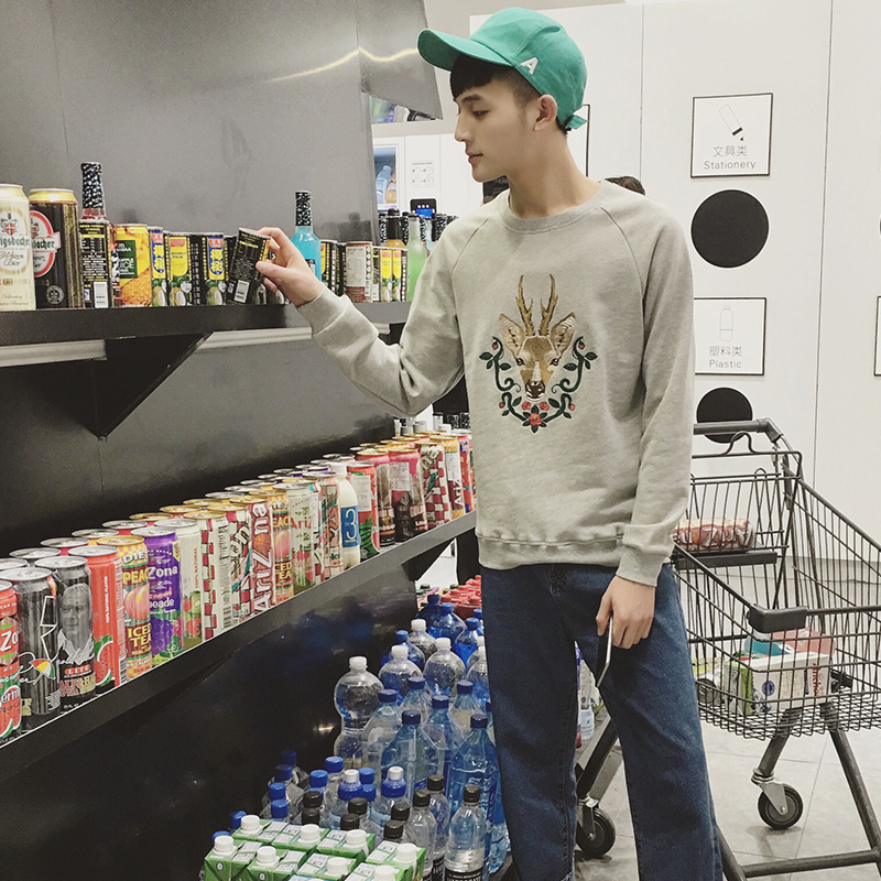 新款秋裝小鹿刺繡韓版修身圓領套頭男士插肩袖衛衣