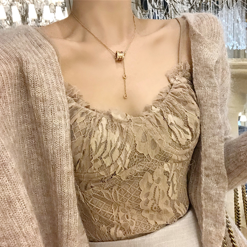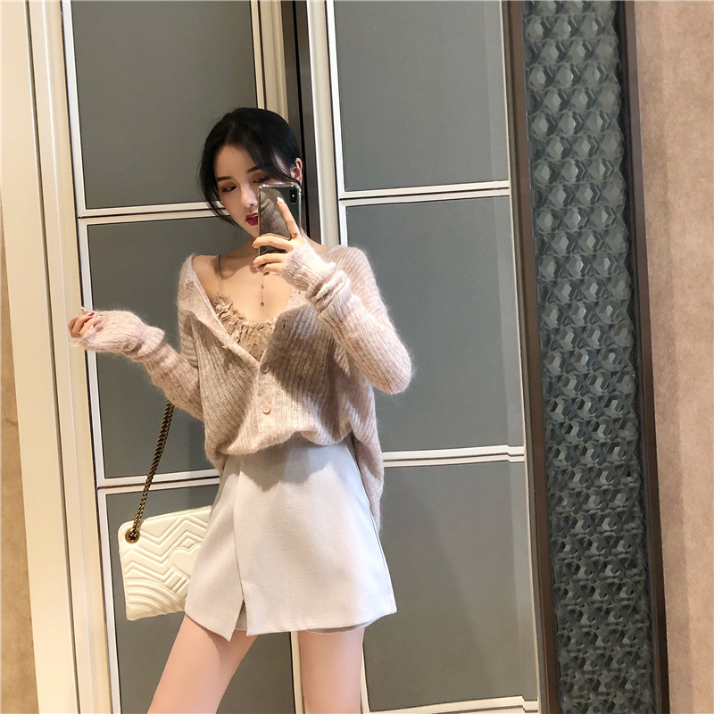 2018秋裝新款時尚套裝百搭毛衣開衫復古蕾絲花邊吊帶港味高腰裙褲