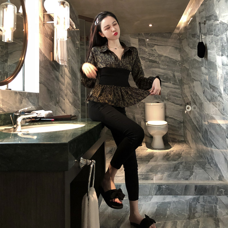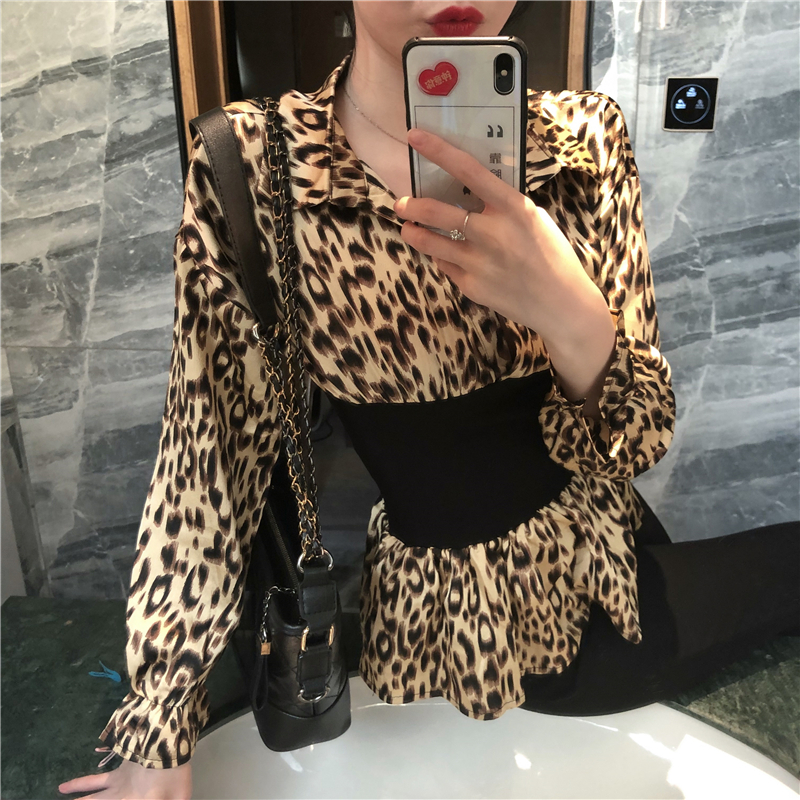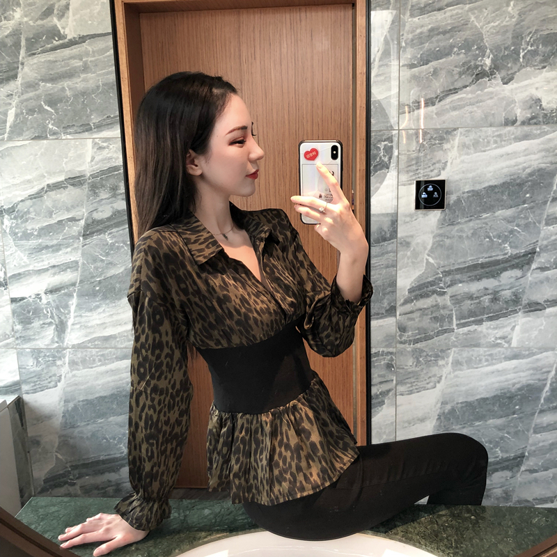/ chic早秋上衣女2018新款韓版白底啊時尚豹紋印花收腰V領拼接襯衫