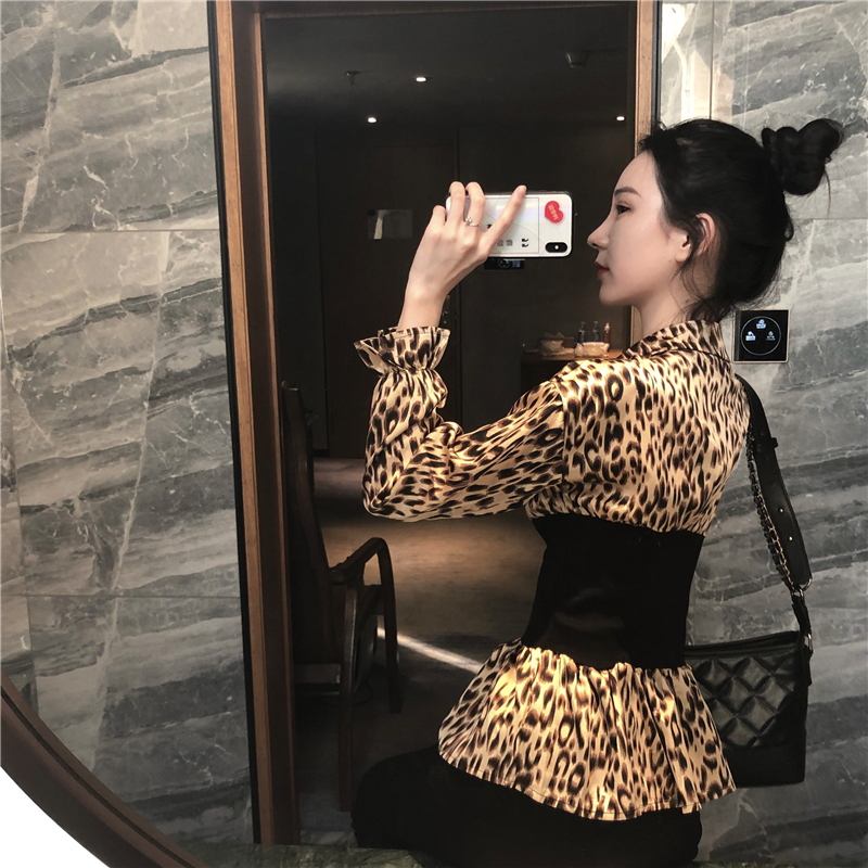 chic早秋上衣女2018新款韓版白底啊時尚豹紋印花收腰V領拼接襯衫