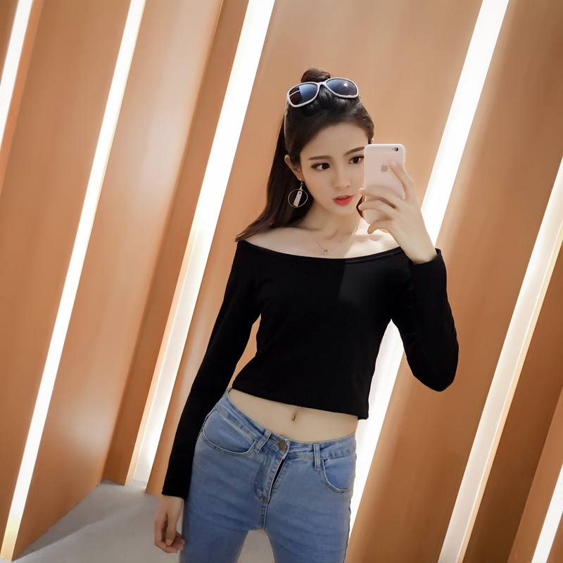 秋裝新款修身一字肩短款打底衫上衣女裝韓版套頭百搭長袖顯瘦T恤