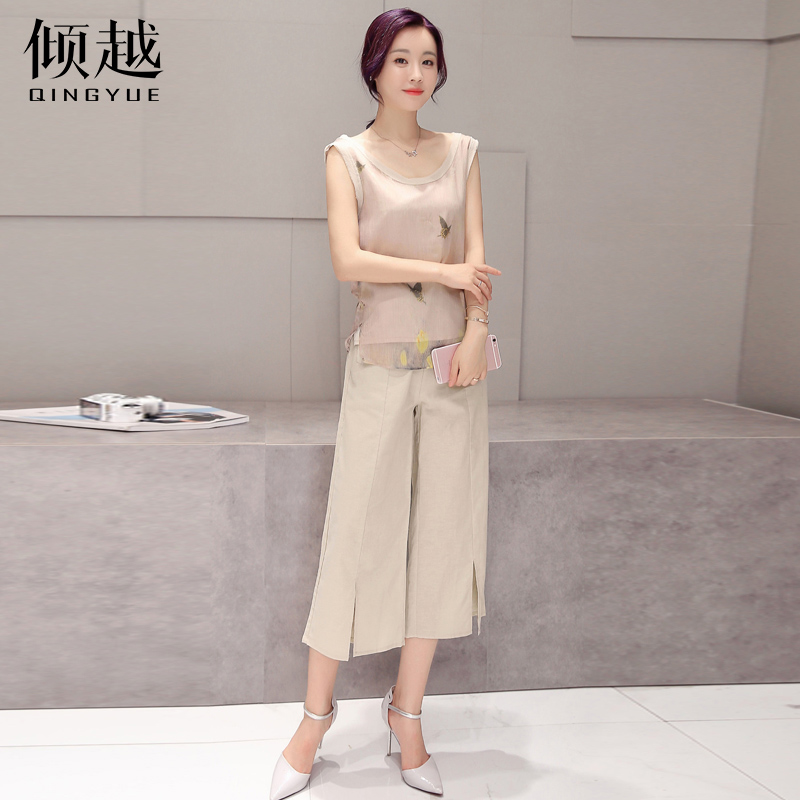 / 傾越春夏套裝2017新款女裝寬松雪紡上衣七分褲三件套韓版氣質百搭